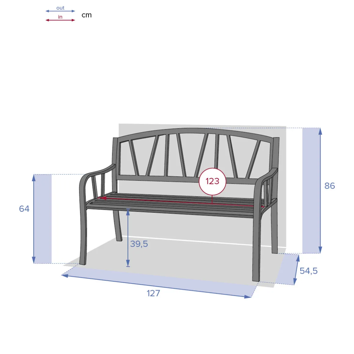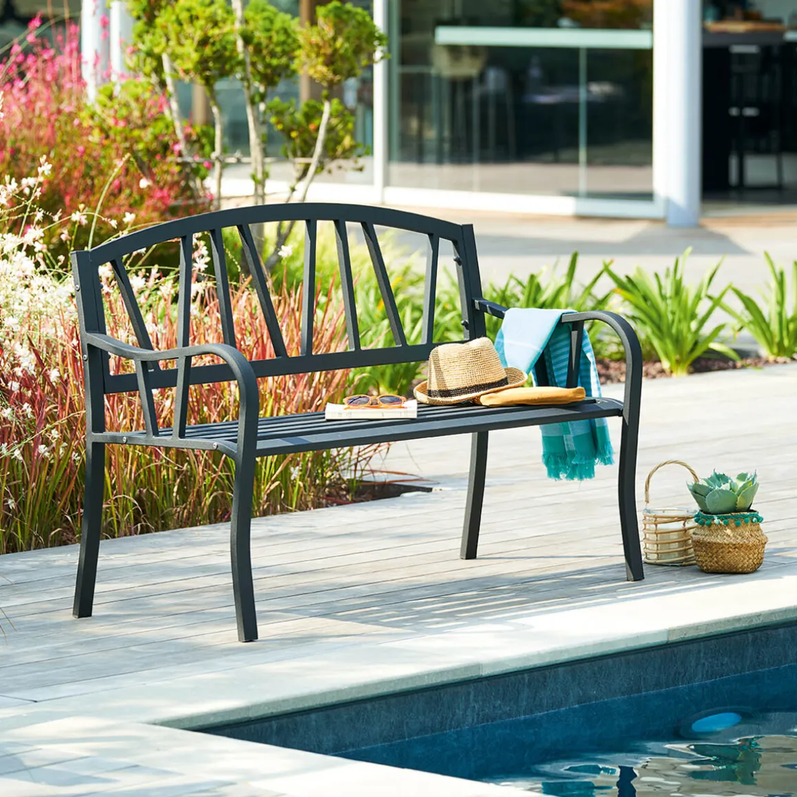 Banco de jardín ALVERNIA negro | 3 Personas | 86×54.5x127cm | Amuebla tu zona exterior con el banco de jardín Alvernia negro, de diseño sobrio y elegante. Ideal para disfrutar del sol. Con sus listones y sus líneas redondeadas, este banco de jardín de 3 plazas puede utilizarse en todo tipo de espacios exteriores. Acero con tratamiento epoxi | Color: Negro | Medidas: 86×54.5x127cm | Material: Acero | Marca: Hespéride