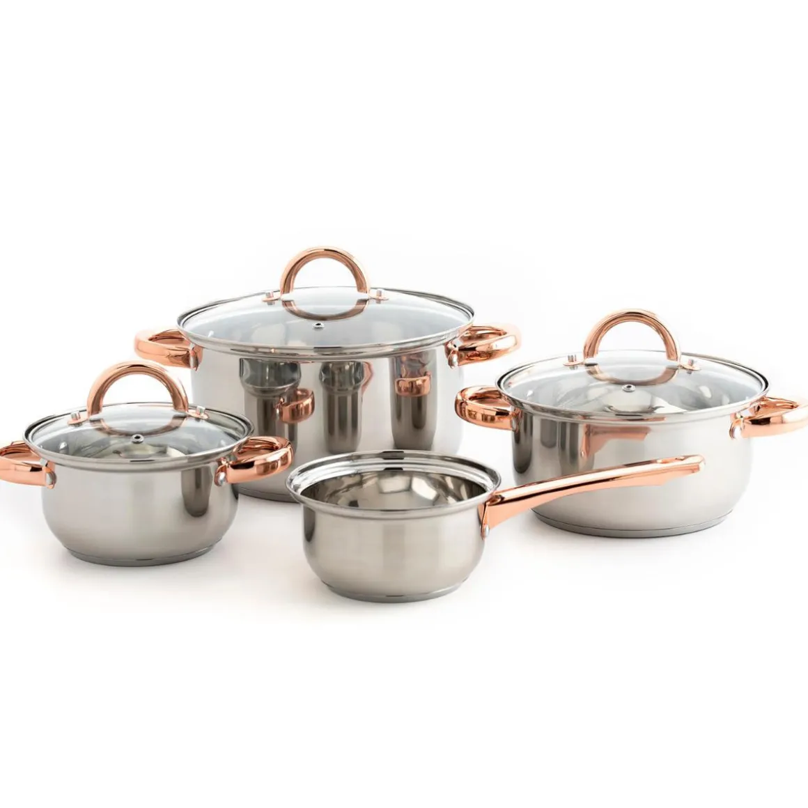 Batería De Cocina 4 Pzas Inoxidable Con Asas De Bronce | Compuesta de: 3 Cacerolas con Tapa de Vidrio, 1 Cazo sin Tapa | Artículo adecuado para todas las fuentes de calor | Descubre todo para tu cocina y horno en homa.es . Ollas, sartenes y cacerolas para cualquier tipo de cocina | Color: Plateado, Bronce | Medidas: 16x26x45cm | Material: Acero inoxidable, Vidrio