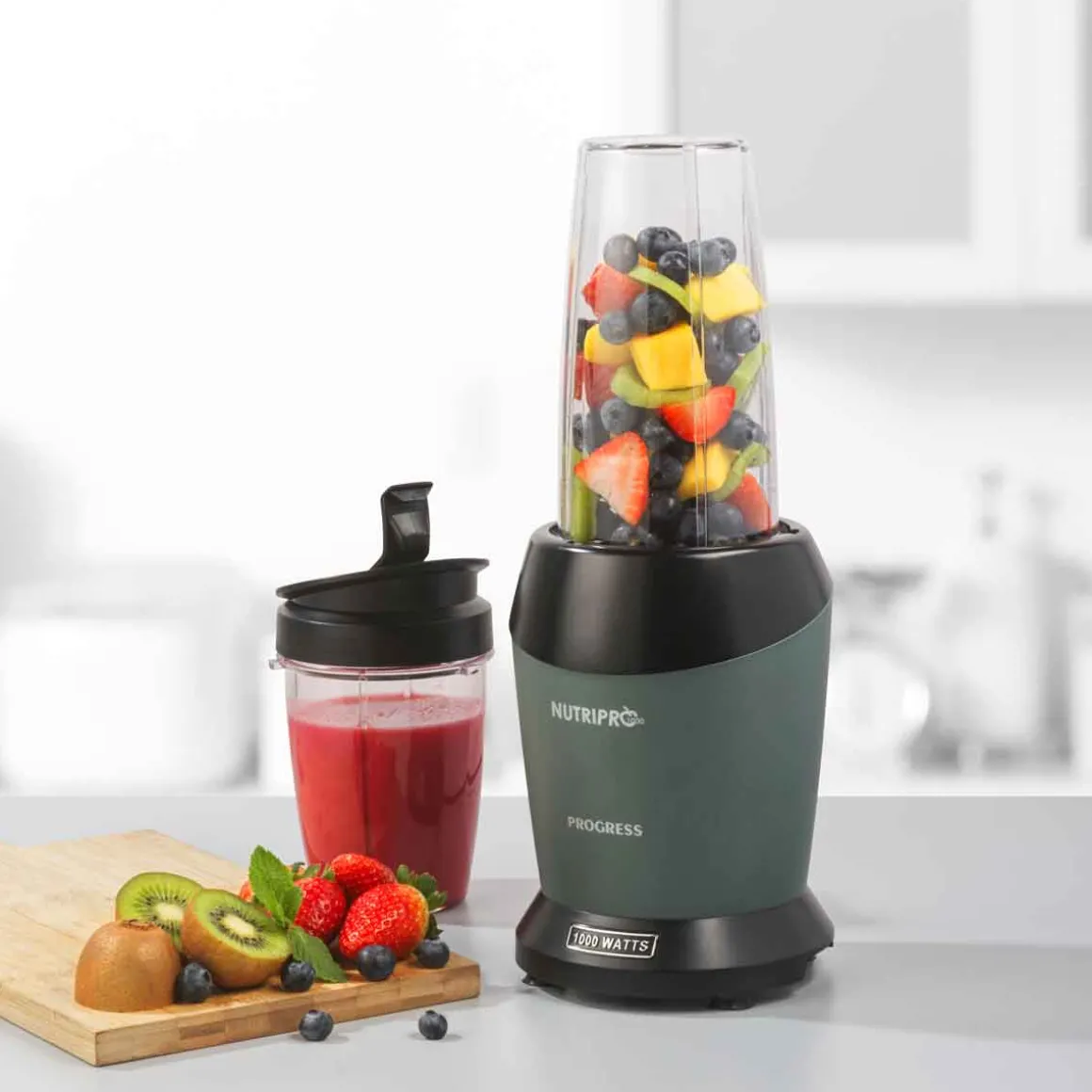 Batidora PROGRESS SHIMMER 1000w | Potencia máxima: 1000w | 2 tazones sobredimensionados: 1l y 800ml. Con 1 tapa easy-drink y 1 tapa de almacenamiento. Contiene 1 cuchilla multiusos. Incluye 50 recetas saludables. ¿Sabías que tu cocina puede ser el lugar más feliz del mundo? Descubre nuestra gama de utensilios para una cocina llena de Happy Home Living. ¡Cocinar con los utensilios adecuados es mucho más fácil! | Color: Verde | Medidas: 39.2×19.9×31.5cm | Material: Plástico