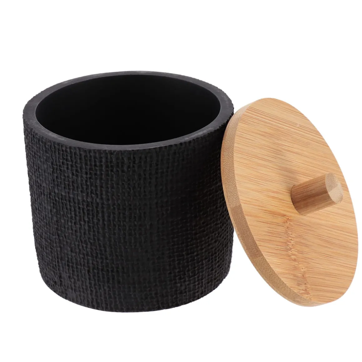 Bote para algodones con efecto malla negro | Los accesorios de Baño y de organización son esenciales para que las rutinas más personales te proporcionen todo el bienestar que mereces. Conoce nuestra nueva colección de accesorios de baño | Color: Negro | Medidas: 11,5x10cm | Material: Poliresina, Bambú