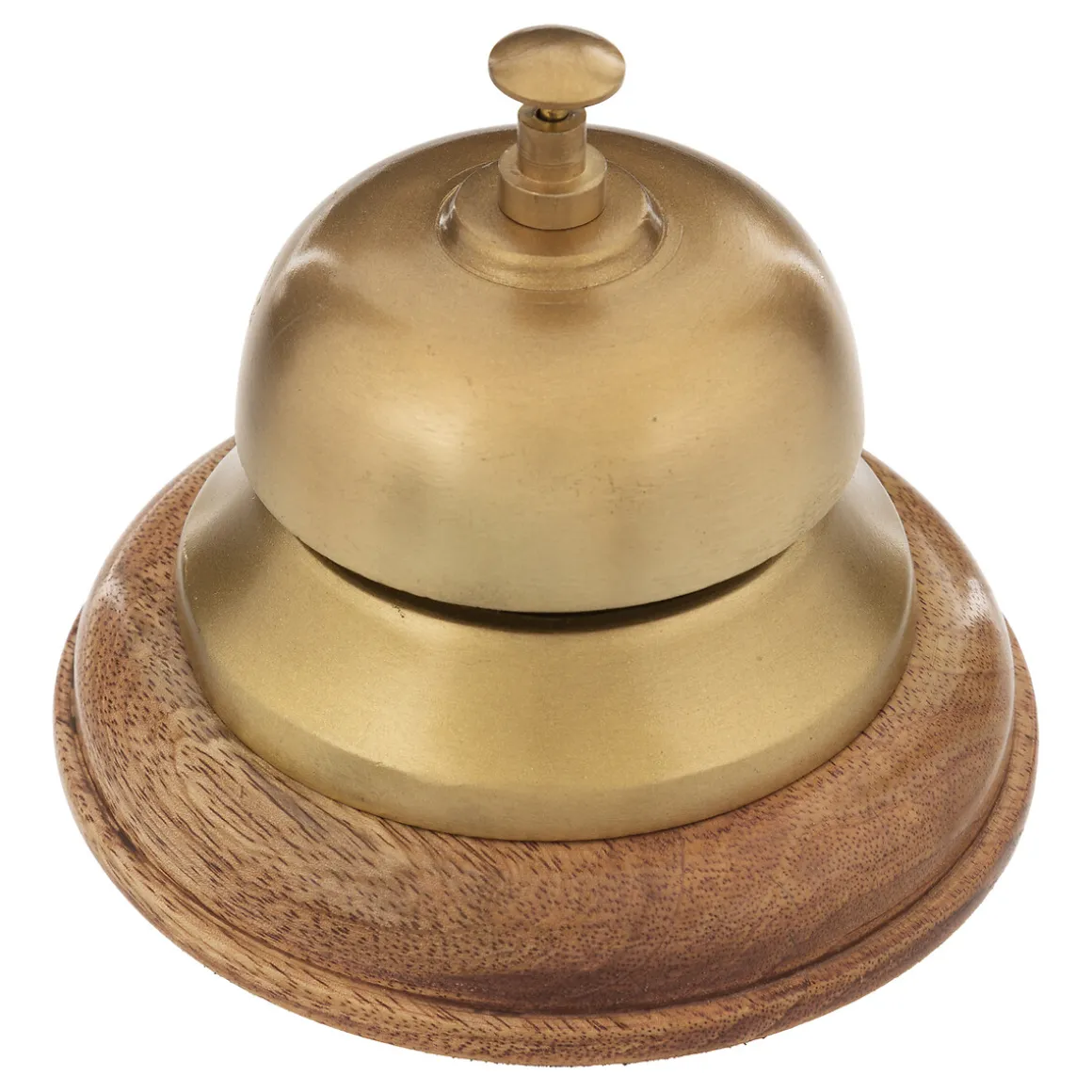 Campana decorativa dorada | En hôma encontrarás los mejores complementos decorativos para tu hogar. Descubre cuál te gusta más… ¡es tuyo! | Color: Dorado, Marrón | Medidas: 12,5x10x10cm | Material: Metal, Madera de Mango | Marca: Atmosphera