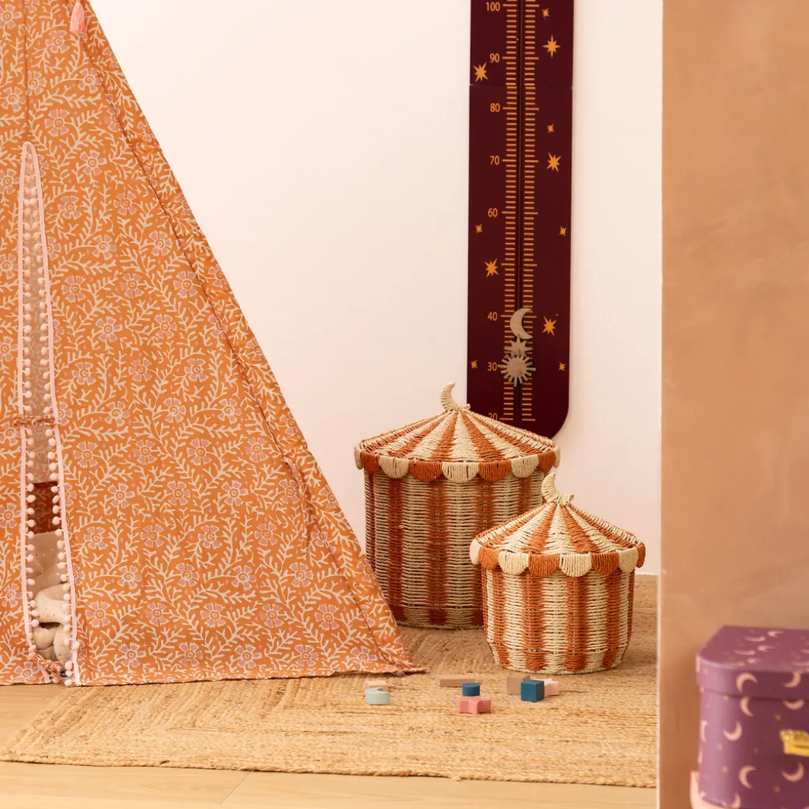 Cesto de almacenaje NOMADE con tapa 37.5cm | Con las soluciones de almacenaje y organización los niños aprenden desde temprano que cada cosa tiene su lugar y crecen en espacios organizados. Descubre mas propuestas hôma Kids en homastores.com | Color: Beige, Naranja | Medidas: 42×37,5cm | Material: Papel, Metal | Marca: Atmosphera4Kids