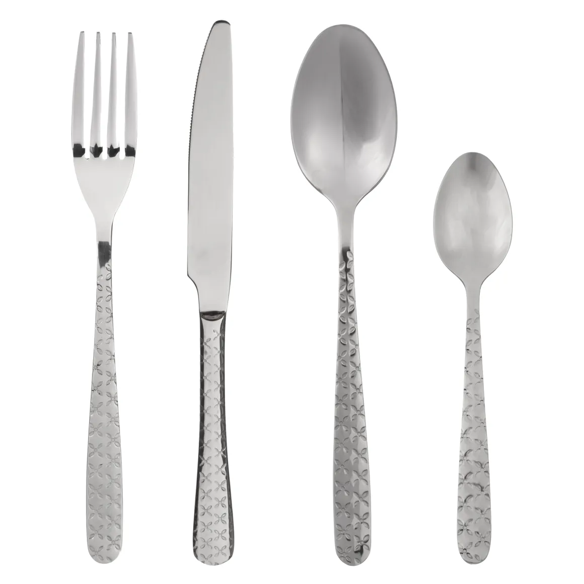 Cubertería 24 Pzas Flora Inoxidable | Apta para Lavavajillas | No recomendada para horno o microondas | Todo lo que tu mesa necesita está en homa.es, echa un vistazo a nuestra colección de vajillas, vasos, cubiertos, posavasos, soportes, piezas para servir, etc. ¡Sirve con Happy Home Living, y todo sabrá mucho mejor! | Color: Plateado | Medidas: 27.5×16.5×6.0cm | Detalle Medidas: Tenedor: 0.8×2.50cm, Grosor: 2.5mm, Peso: 40g, Cuchillo: 23.20×1.80cm, Grosor: 5.1mm, Peso: 77.8g, Cuchara sopera: 20.1×4.0cm, Grosor: 2.5mm, Peso: 46g, Cuchara de postre: 15.7×3.10cm, Grosor: 2mm, Peso: 26.4g | Material: Acero inoxidable | Marca: Secret D’Gourmet