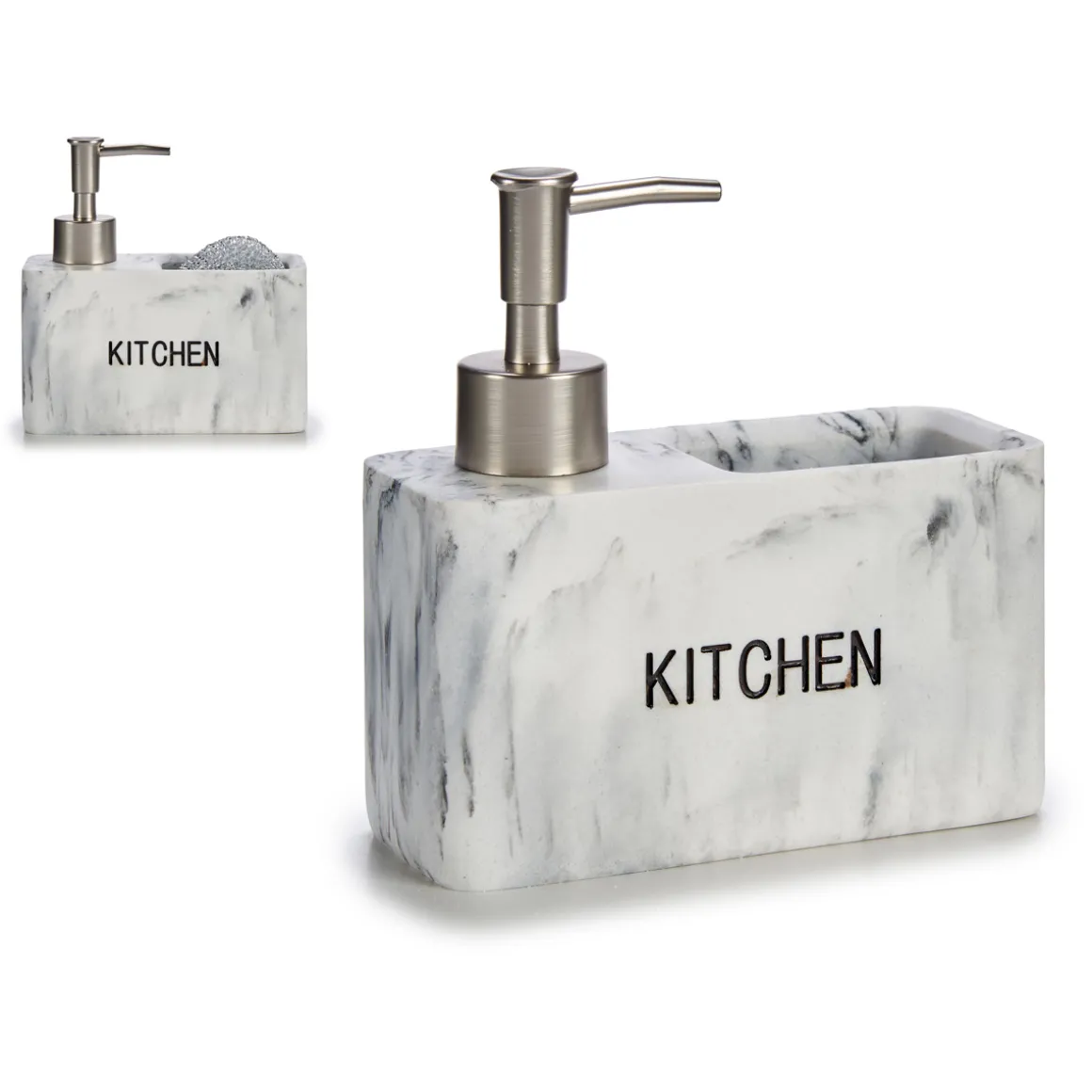 Dosificador Mármol Con Porta Estropajo | La funcionalidad en la cocina es esencial y comienza con las soluciones de almacenamiento para la cocina. Desde el carrito multiusos, al botellero o los cubos de basura y reciclaje, encuéntralo todo en homa.es | Color: Blanco, Gris | Medidas: 13.5x6x14.5cm | Material: Mármol