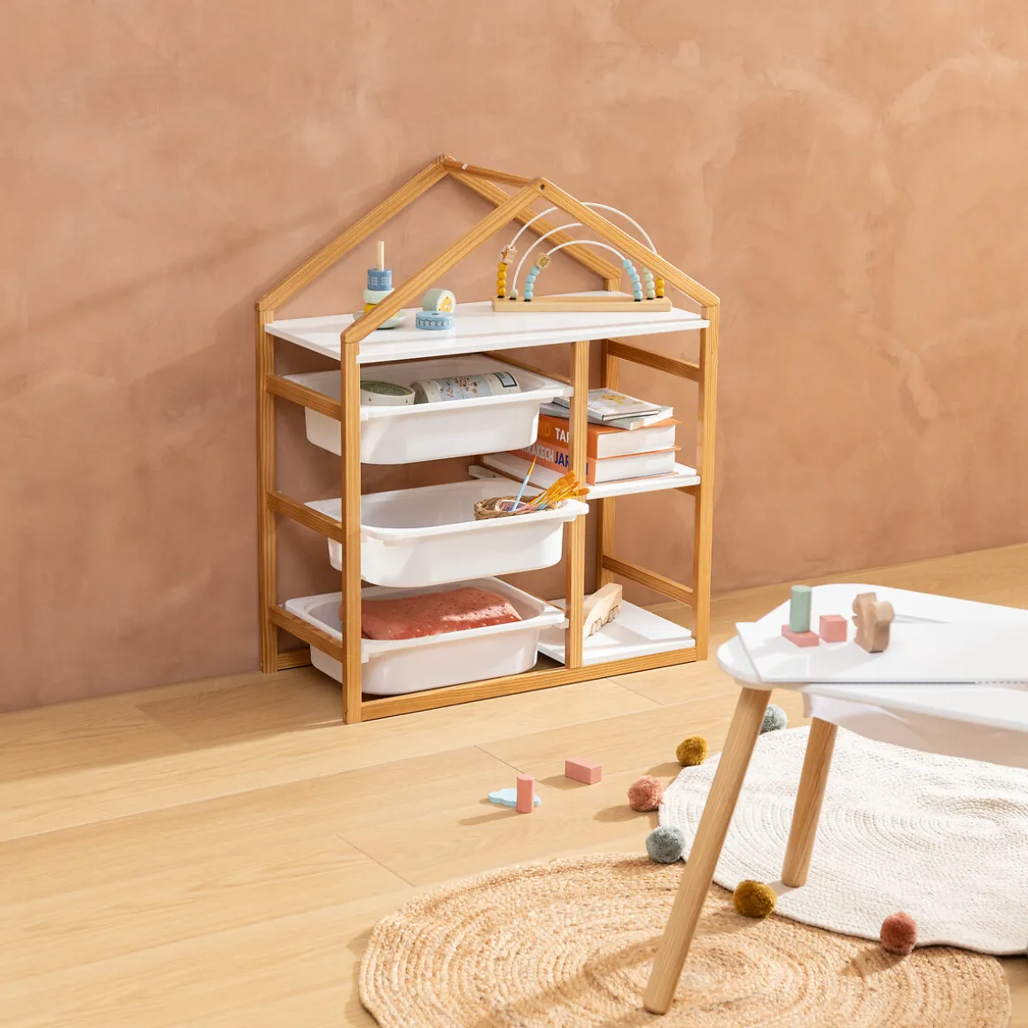Estantería BAKO de 3 niveles con 3 cestas | 82x30x68cm | ¡Descubre nuestra colección de muebles infantiles! Con hôma kids es fácil regalar a los más pequeños aventuras y mundos imaginarios. Muebles para la habitación del bebé y áreas de juego | Color: Blanco, Marrón claro | Medidas: 82x30x68cm | Material: MDF, Madera de pino | Marca: Atmosphera4Kids
