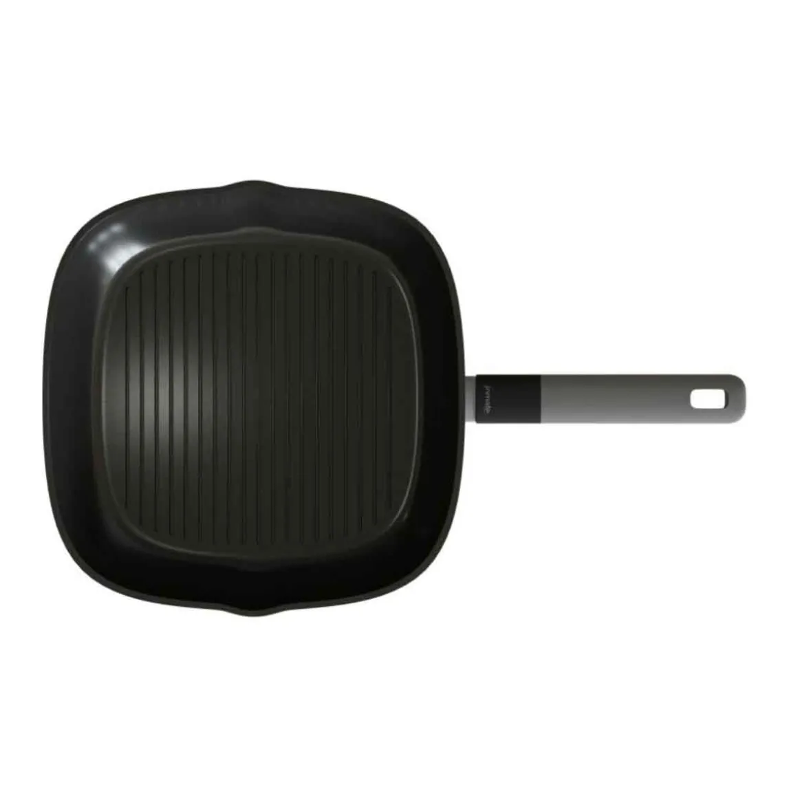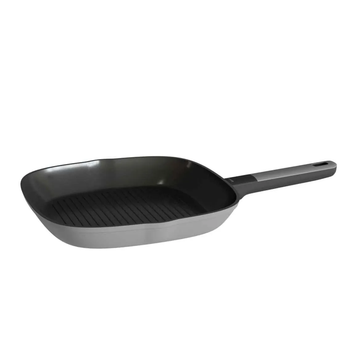 Grill NEUTRAL GREY 28cm | Nuestra gama NEUTRAL GREY está diseñada para una fácil limpieza, gracias a su revestimiento cerámico antiadherente que desprende los alimentos con mayor facilidad. Esta gama te permite cocinar de forma más sana y con poca o ninguna grasa. Fabricada en aluminio forjado, con asas y tiradores de baquelita de tacto suave. El fondo de inducción es compatible con todas las fuentes de calor, incluidas las placas de inducción, vitrocerámicas, de gas y eléctricas. El interior cerámico garantiza una cocción uniforme. | Recomendamos lavar a mano, usar a fuego bajo o medio y en el tamaño adecuado, no usar objetos metálicos, no meter en el horno | Antes del primer uso: Lavar el artículo con agua, detergente y una esponja suave. Verter agua en la olla y llevar a ebullición. Retirar el agua y engrasarla con grasa de cocina. Quite el exceso. | Color: Gris | Medidas: 28cm | Material: Aluminio antiadherente