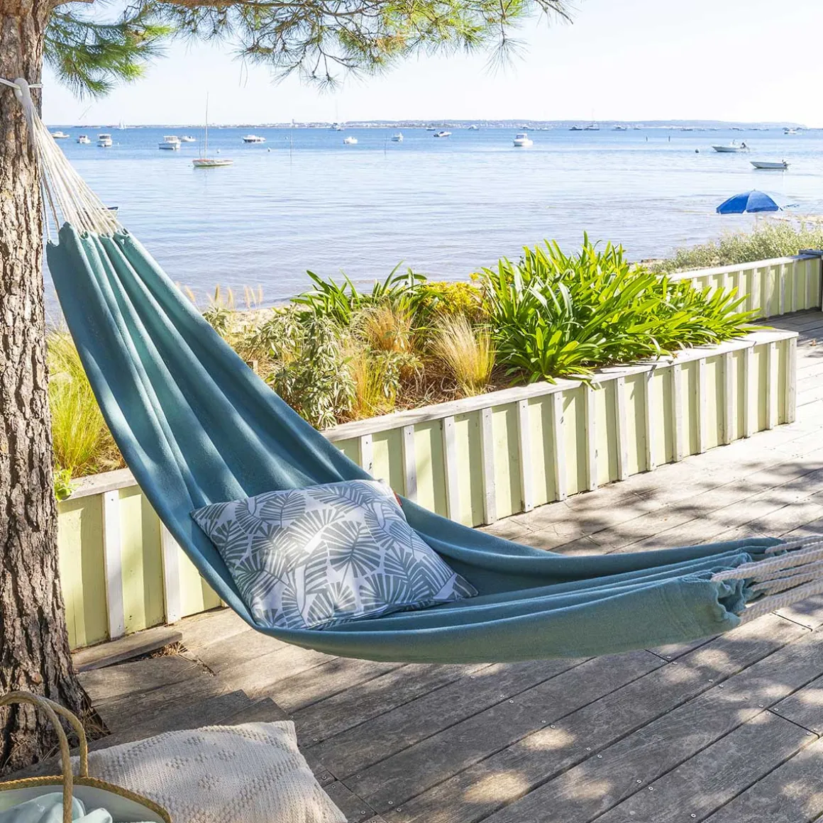 Hamaca colgante YAQUI verde 80x307cm | 80x307cm | Las cuerdas estiradas permitirán que te relajes con seguridad y confianza | Viene con una bolsa de transporte para facilitar el manejo. Se recomienda limpiar la alfombra con agua y jabón luego guardar en un lugar seco | Color: Verde | Medidas: 80x307cm | Material: Algodón, Poliéster | Marca: Hespéride