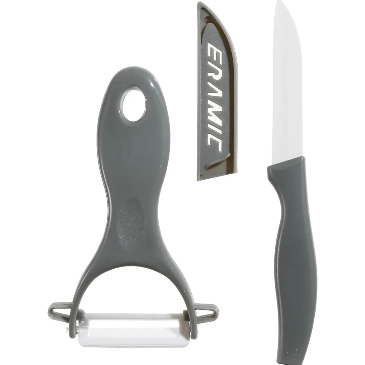 Juego Cuchillo+Pelador De Cerámica | Todo lo que tu mesa necesita está en homa.es, echa un vistazo a nuestra colección de vajillas, vasos, cubiertos, posavasos, soportes, etc. ¡Sirve con Happy Home Living, y todo sabrá mucho mejor! | Color: Gris | Medidas: 2×7.7x15cm | Medidas Detalladas : Cuchillo: 14×7.7x2cm , Pelador: 15×7.7x2cm , Funda de la Cuchilla: 8×1.7×0.6cm | Material: Cerámica, Abs, Plástico | Marca: 5Five