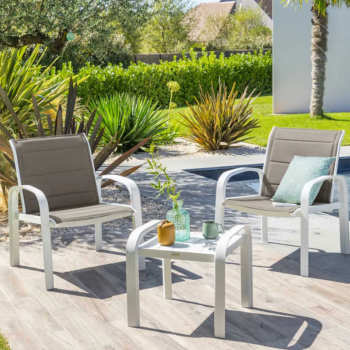 Juego de jardín ELYN 2 plazas | Conjunto compuesto por 2 sillones y 1 mesa | Medidas del sillón: 66x68x84cm, Medidas de la mesa: 52x49x46.5cm | Material: Aluminio y Textilene | Color: Beige y Blanco | Marca: Hespéride