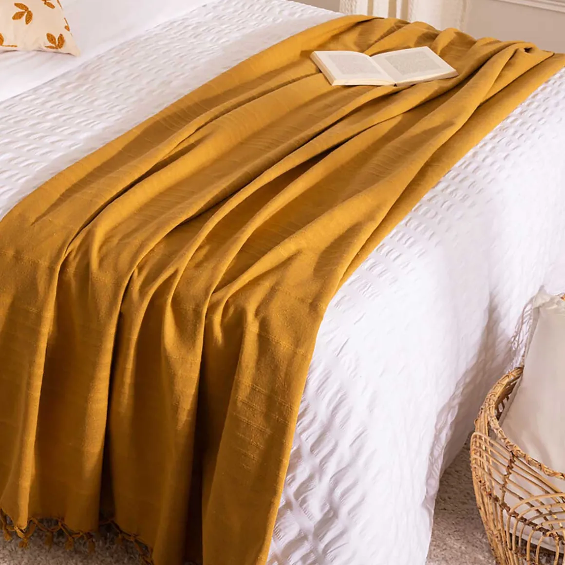 Manta Con Flecos Ocre 160x220cm | La colección textil hôma reúne propuestas únicas para personalizar tu hogar. Desde cojines decorativos y fundas de cojín hasta las mantas más confortables, ¡vive en tu hogar con toda comodidad! | Color: Ocre | Medidas: 160x220cm | Material: Algodón