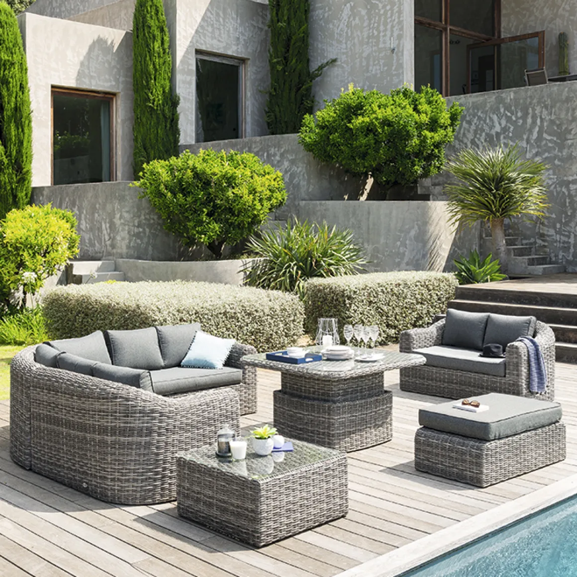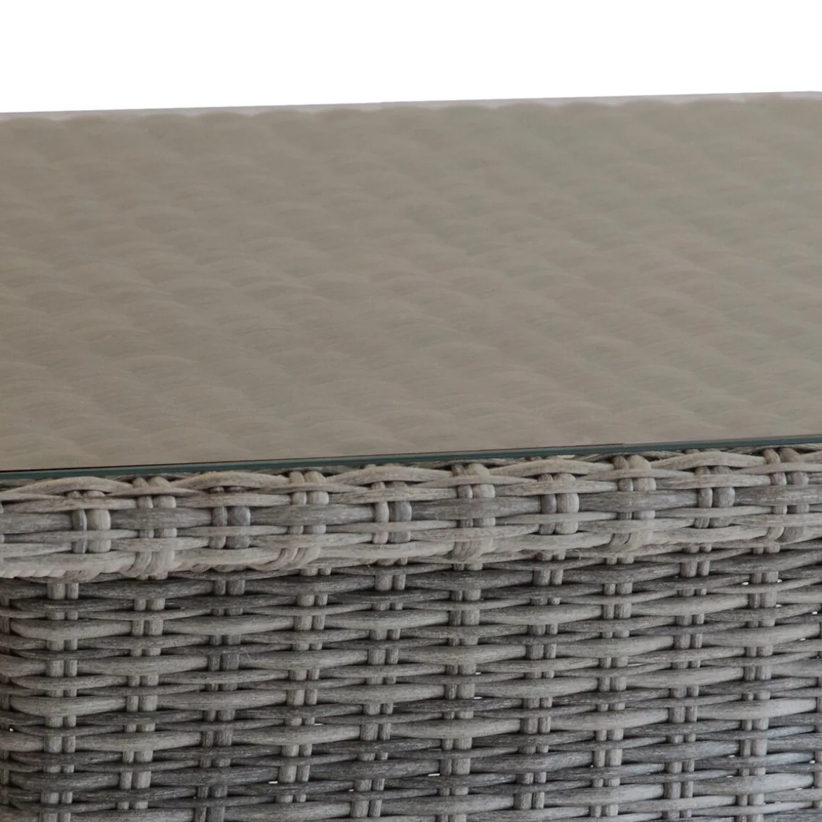 Mesa Auxiliar Cuadrada Mooréa Terre D’Ombre Con Tapa De Vidrio Templado | Altura máxima de la mesa: 69cm, Altura mínima de la mesa: 45cm | Esta mesa cuadrada de jardín ha sido diseñada con una estructura de aluminio mecanizada para ajustar la altura de la tapa | Estructura con tratamiento epoxi antioxidante. Patas ajustables para compensar las irregularidades del suelo y proporcionar una mejor estabilidad | Color: Gris | Medidas: 45-69x110x110cm | Material: Aluminio, Ratán sintético, Vidrio templado | Colección: Mooréa | Marca: Hespéride