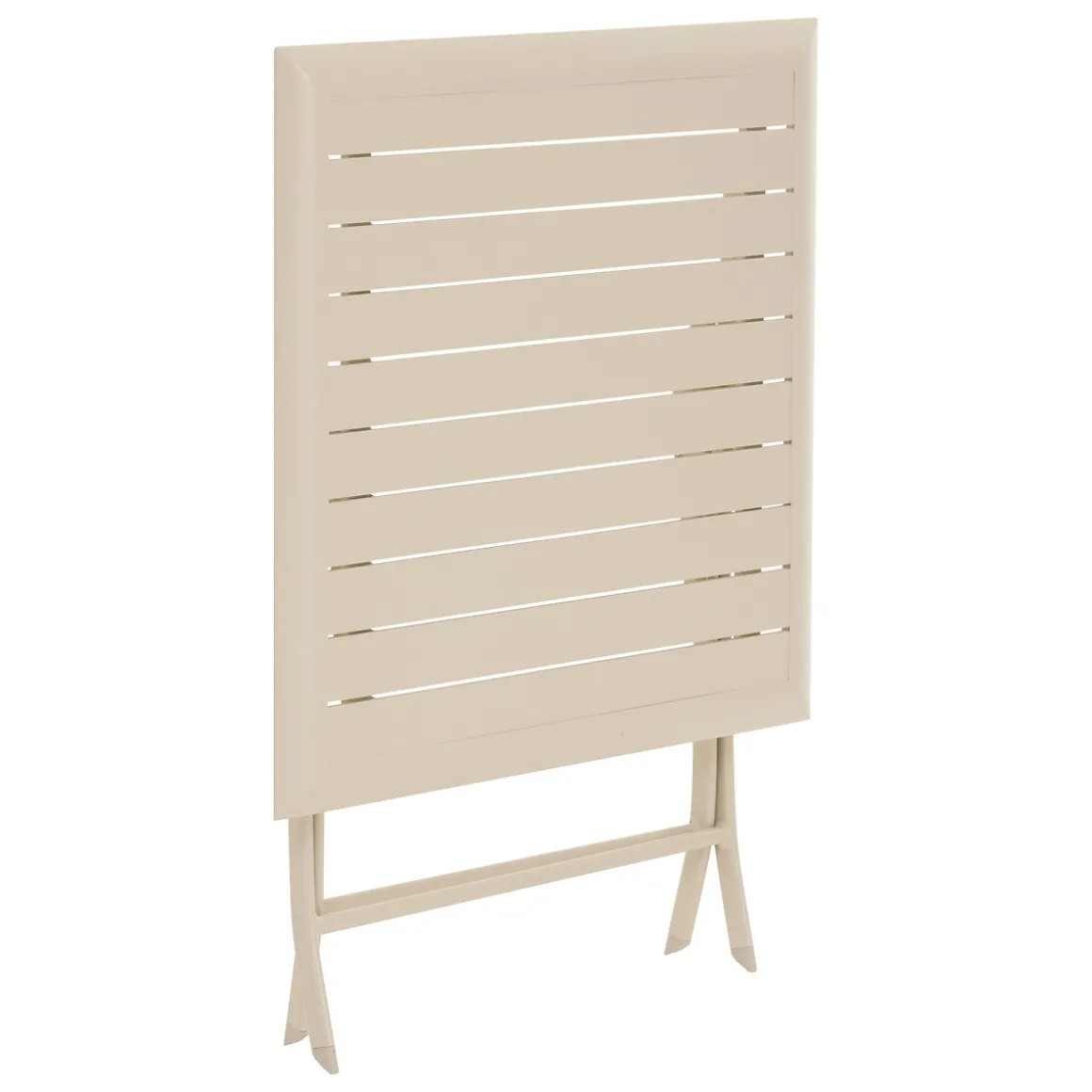 Mesa plegable AZUA argile | La mesa plegable cuadrada Azua de aluminio , para 2 plazas, es muy práctica. Su tapa se pliega sobre la estructura de las patas para permanecer en posición vertical, lo que permite guardarla en espacios estrechos. Sugerimos combinarla con las sillas Modula | Medidas: 71x71x71cm