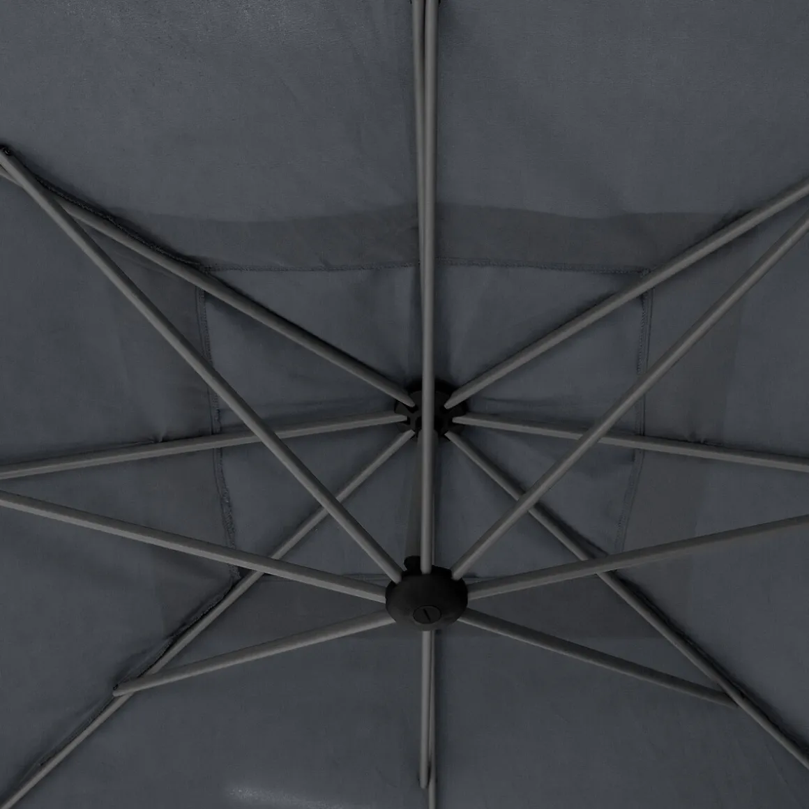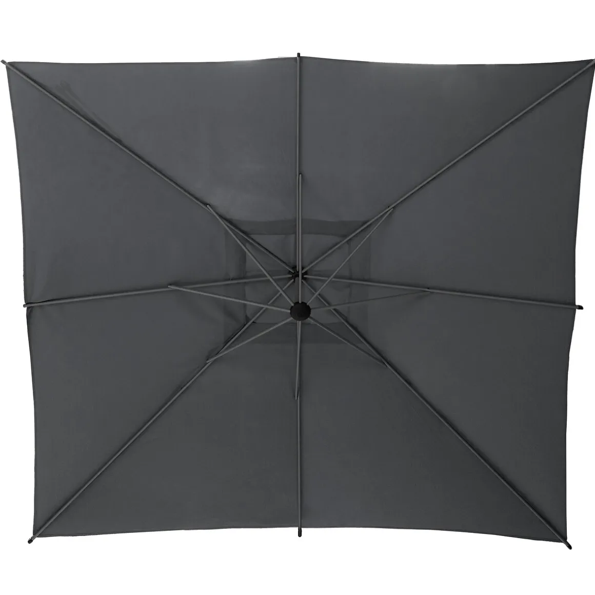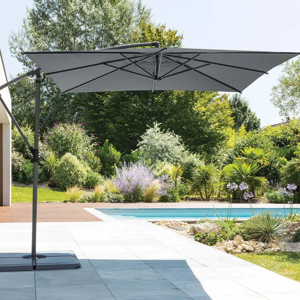 Parasol MANOA ardósia 2.5×2.5m | Base no incluida | Tejido con tratamiento hidrófugo que permite que el agua resbale sin penetrar en el material | Chimenea de ventilación para facilitar la circulación del aire | Protección UV | Rotación de 360° | Lona atornillada al extremo de las varillas para un mejor mantenimiento de la lona | Cremallera elástica mariposa | Tipo de apertura: Manivela Push up | Color: Gris ardósia | Medidas: 2.4×2.5×2.5m | Material: Acero, Aluminio, Poliéster | Marca: Hespéride