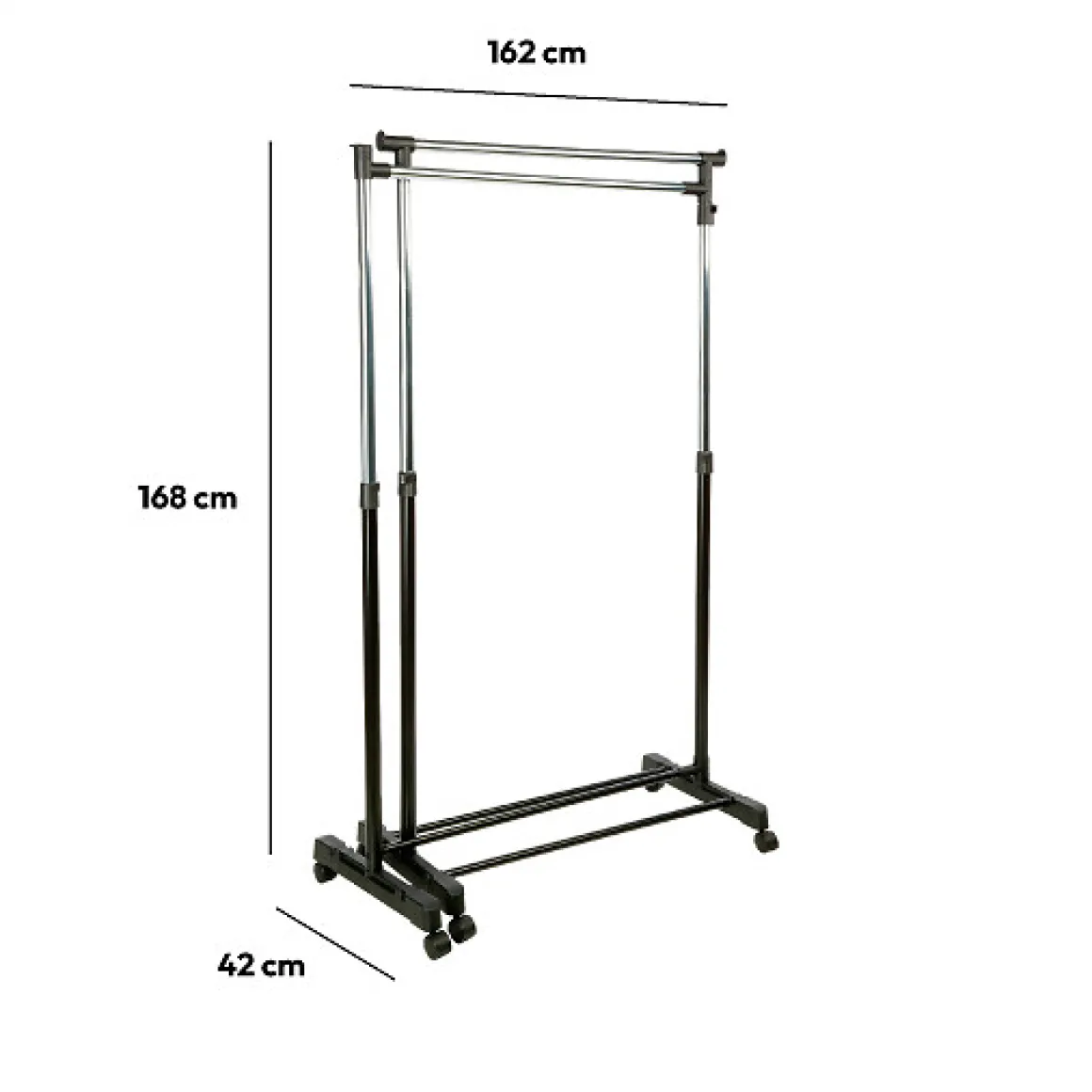 Perchero Con 1 Barra Giratoria | 168x42x162cm | Altura Extensible: 107/168cm, Largo Extensible: 88/162cm | Capacidad Máxima: 20kg | Conoce este y más artículos que tenemos disponibles para tu hogar. ¡Ordenar y organizar tus armarios y vestidores nunca ha sido tan fácil! Descubre la gama de almacenaje hôma | Color: Negro, Plateado | Medidas: 168x42x162cm | Material: Metal, Plástico | Marca: 5Five