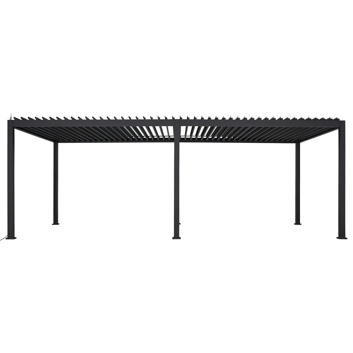 Pérgola ÉVORA gris grafito 3.6×3.6m | Apertura de lamas eléctrica | Lamas regulables por mando a distancia. Los juegos de cortinas/mosquiteras y persianas se venden por separado. El agua drena por la base de los pies | Color: Grafito | Medidas: 250x360x600cm | Material: Aluminio | Marca: Hespéride