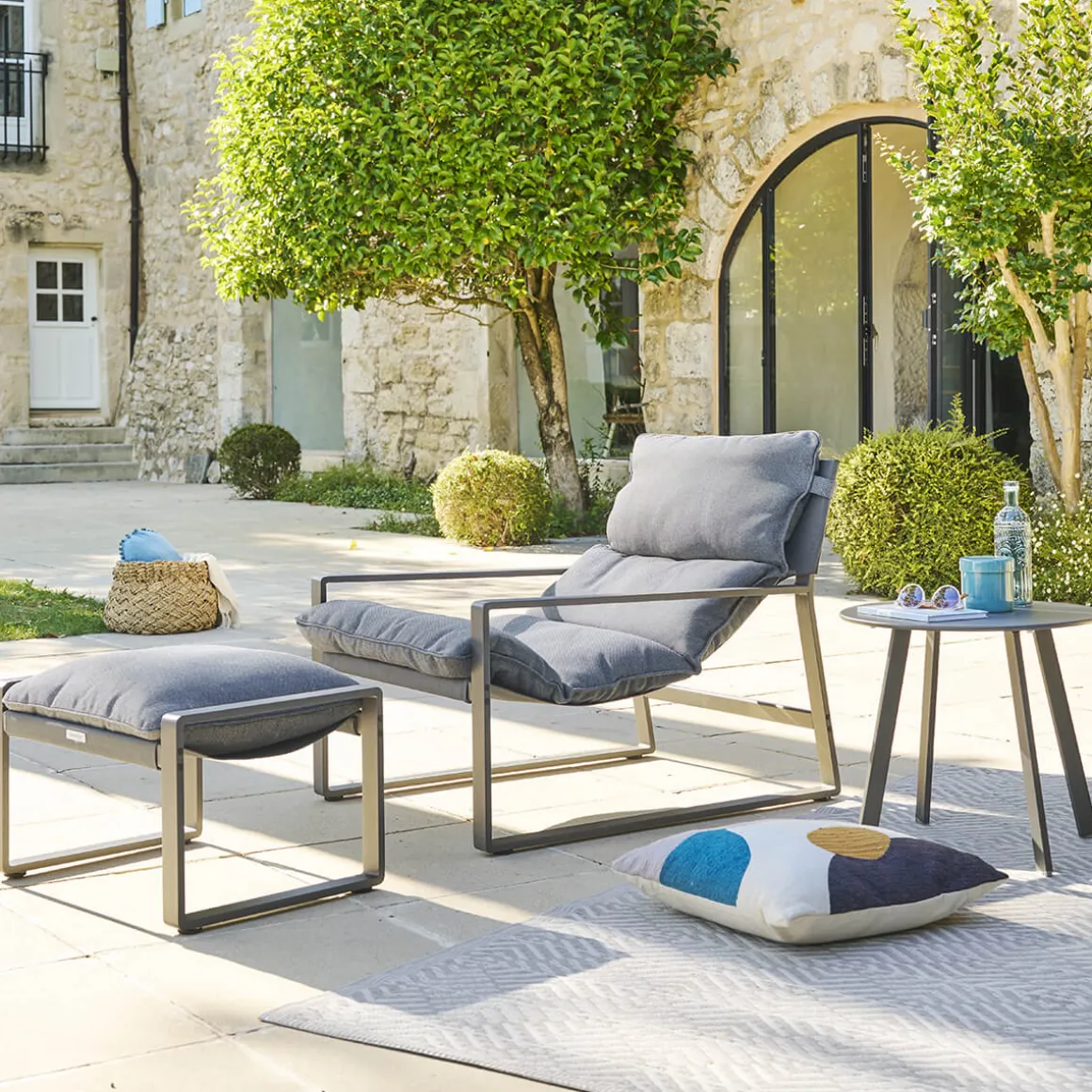 Silla relax LAMBINIO gris grafito | 72.5x69x92.5cm | Estructura tratada con epoxi antioxidante. Producto tratado contra la decoloración. El tejido hidrófugo permite que el agua resbale sin penetrar en el material. Posibilidad de guardar el puf debajo del sillón | Color: Gris Grafito | Medidas: 72.5x69x92.5cm; Puf: 36.5x45x60cm | Material: Aluminio, Poliéster | Marca: Hespéride