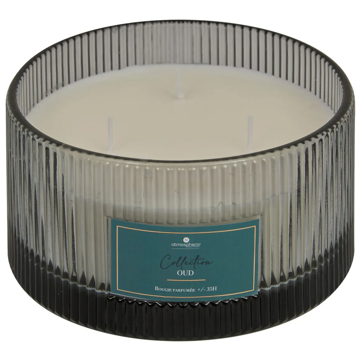 Vela perfumada con portavelas de vidrio COLLECTION oud 635gr | Descubre nuestra gama de velas y velones decorativos para el hogar. La mejor decoración para el hogar es el oud. | Color: Gris | Medidas: 8.1×15.1×15.1cm | Material: Vidrio y Parafina | Aroma: Oud | Capacidad: 635gr | Marca: Atmosphera
