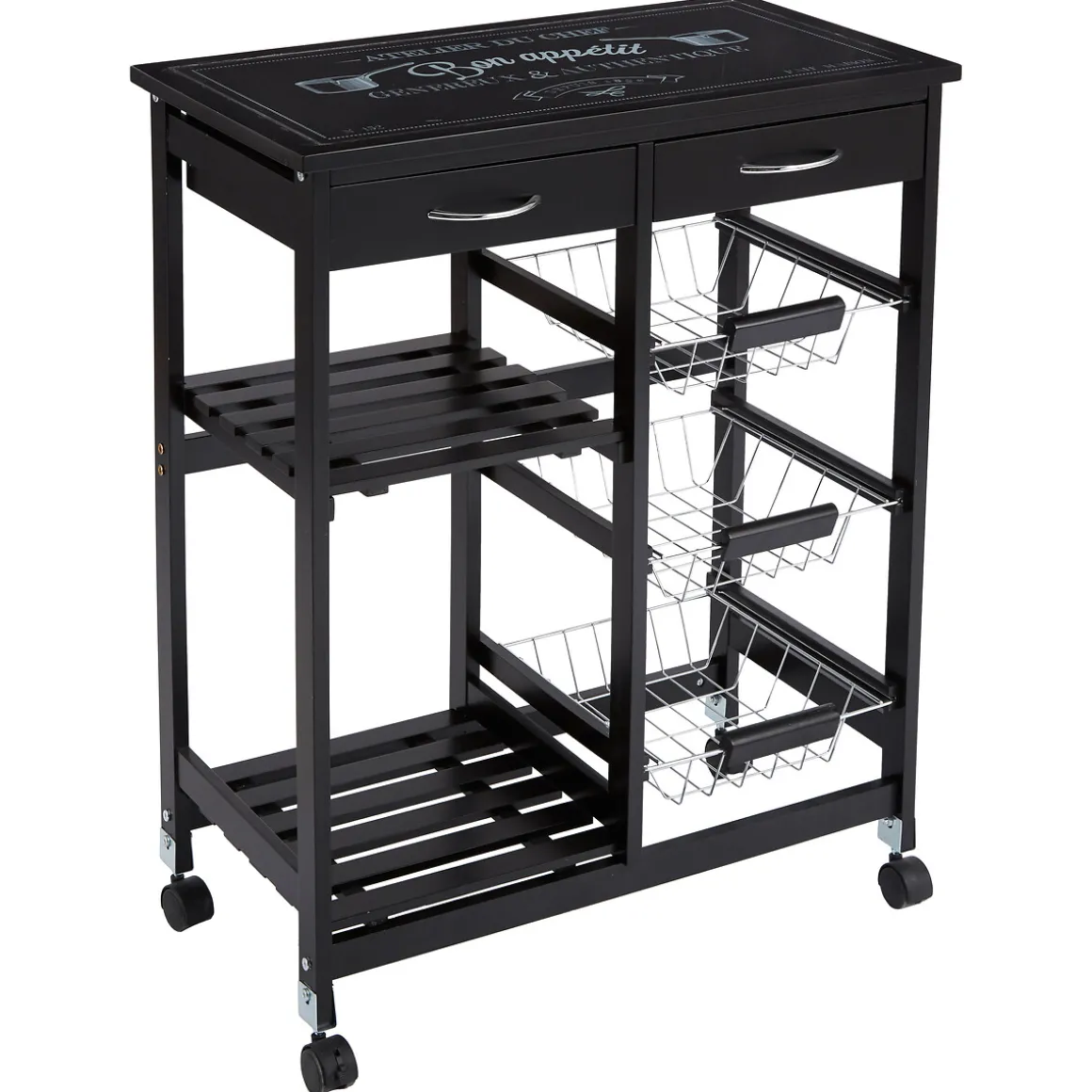 Carrito Auxiliar De Cocina Negro 81.5x35x65.5cm | A Montar | Incluye 2 Estantes, 2 Cajones, 3 Cestas, 4 Ruedas Para Mejor Deslizamiento | ¡Haz de tu cocina el lugar más feliz del mundo! Descubre nuestra gama de muebles de cocina y crea un espacio feliz, práctico e inspirador para tus comidas. homa.es, ¡Donde todo es apetecible! | Color: Negro | Medidas: 81.5x35x65.55cm | Material: Mdf, Madera de Pino, Metal, Pvc | Marca: Secret D’Gourmet