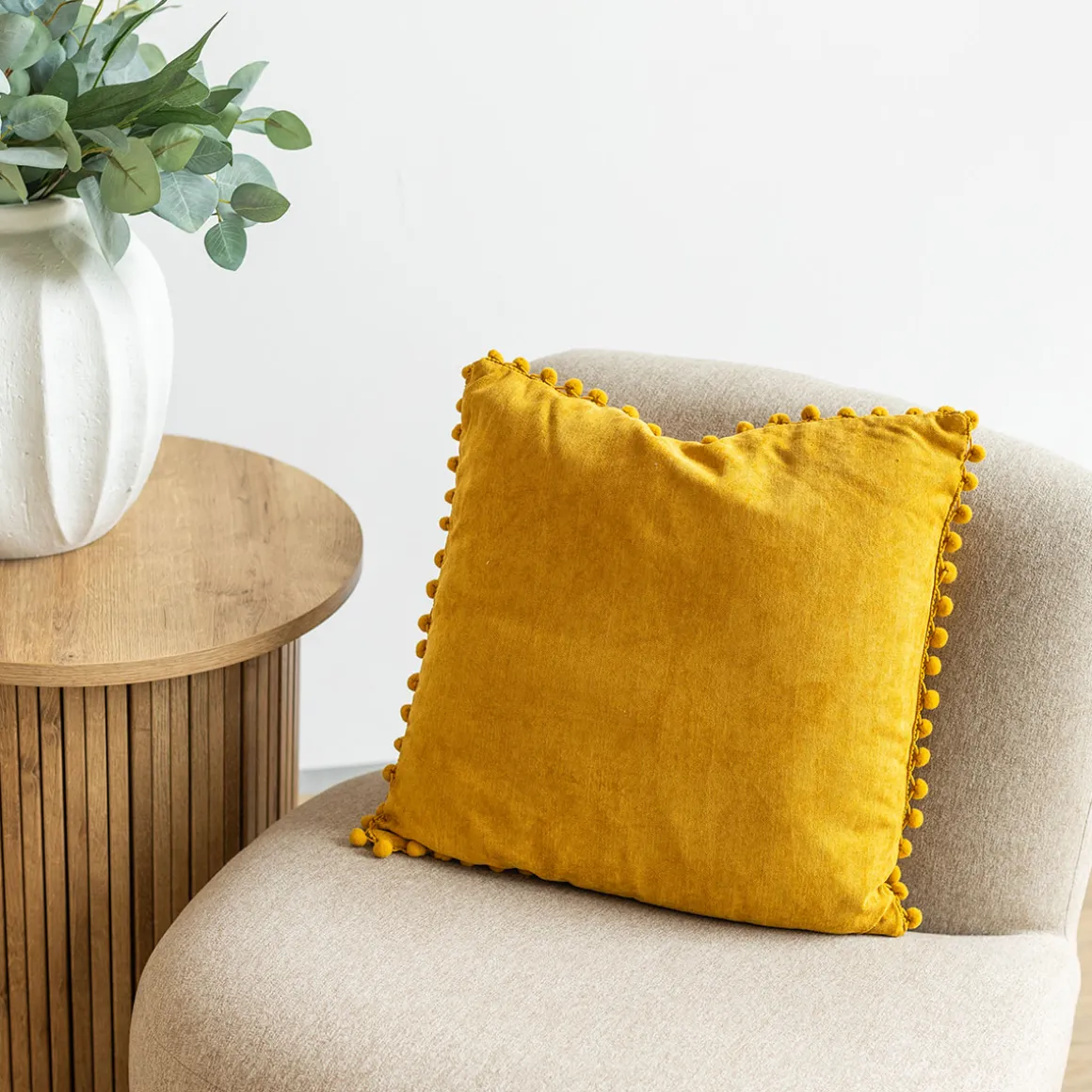 Cojín Ocre Con Pompones 40x40cm | La colección textil hôma reúne propuestas únicas para personalizar tu hogar. Desde cojines decorativos y fundas de cojín hasta las mantas más confortables, ¡vive en tu hogar con toda comodidad! | Color: Ocre | Medidas: 40x40cm | Material: Poliéster, Nailon | Marca: Atmopshera
