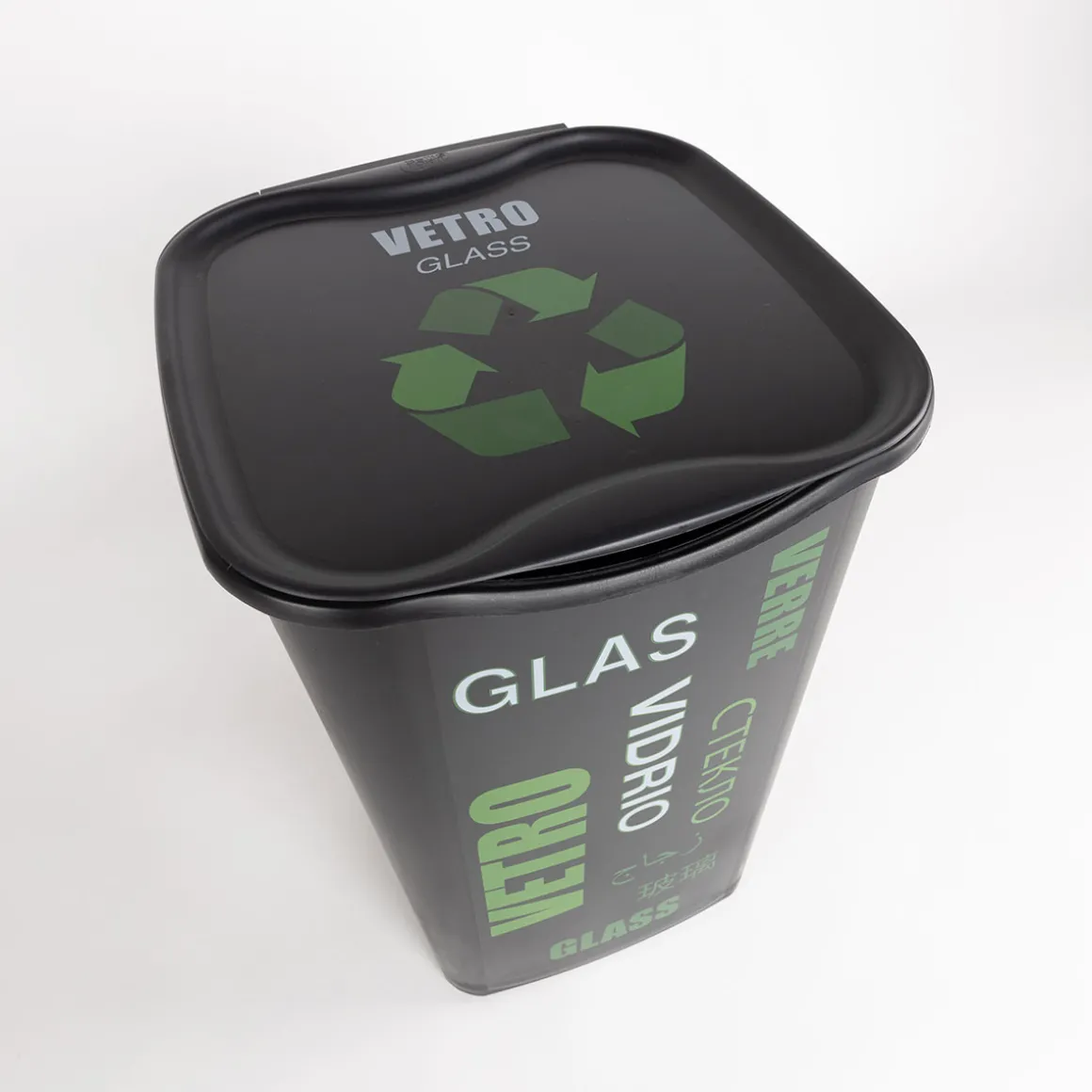 Cubo de reciclaje para vidrio negro 50L | La funcionalidad de la cocina es esencial y comienza por las soluciones de organización en la cocina. Desde el carrito auxiliar , la botellera, los cubos de basura, hasta cubos de reciclaje, encuentra todo en homastores.com | Color: Negro y Verde | Medidas: 53.3x36x37.5cm | Material: Polipropileno