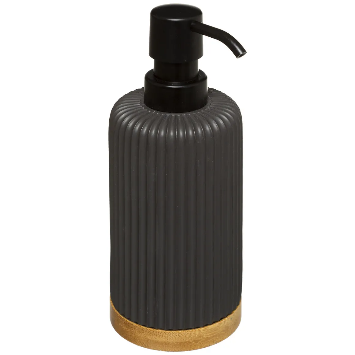 Dispensador De Jabón Líquido Con Base De Bambú Natureo | Los accesorios y la organización del baño son esenciales para que tus rutinas más personales te traigan todo el bienestar que te mereces. ¡Conoce nuestra colección de accesorios para el baño! | Color: Negro | Medidas: 19x7cm | Material: Poliresina, Abs, Bambú | Capacidad: 270ml | Colección: Natureo | Marca: 5Five