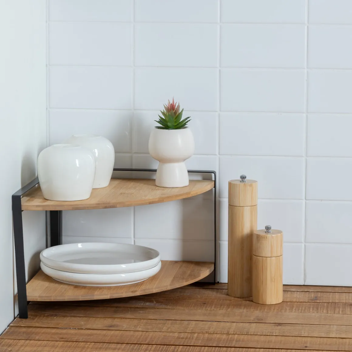 Esquinera de 2 niveles ORDERA beige | La funcionalidad de la cocina es esencial y comienza por las soluciones de organización en la cocina. Desde el carrito auxiliar , la botellera, los cubos de basura, hasta cubos de reciclaje, encuentra todo en homastores.com | Color: Beige | Medidas: 20.5×29.3×29.6cm| Material: Bambú y metal | Marca: 5Five
