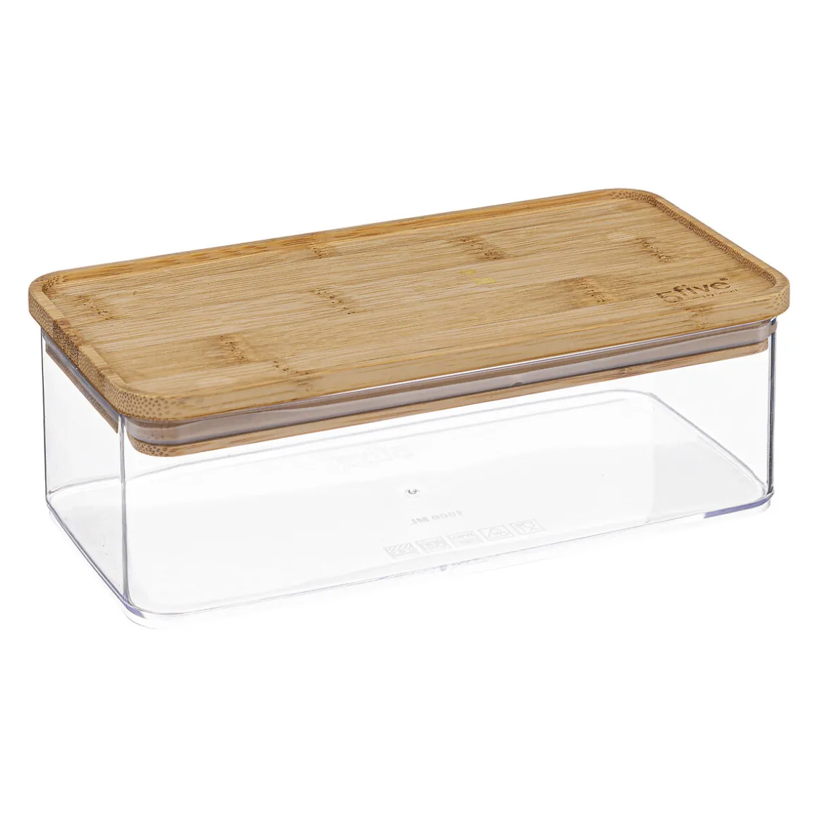 Hermético ESKE apilable con tapa de bambú | No usar en microondas, horno ni congelador | Se puede lavar en lavavajillas, excepto la tapa | La funcionalidad en la cocina es esencial y comienza con las soluciones de almacenamiento para la cocina. Desde el carrito multiusos, al botellero o los cubos de basura y reciclaje, encuéntralo todo en homa.es | Color: Marrón, Transparente | Medidas: 7.3×10.4×20.4cm | Material: Poliestireno, Bambú | Capacidad: 1L | Marca: 5Five