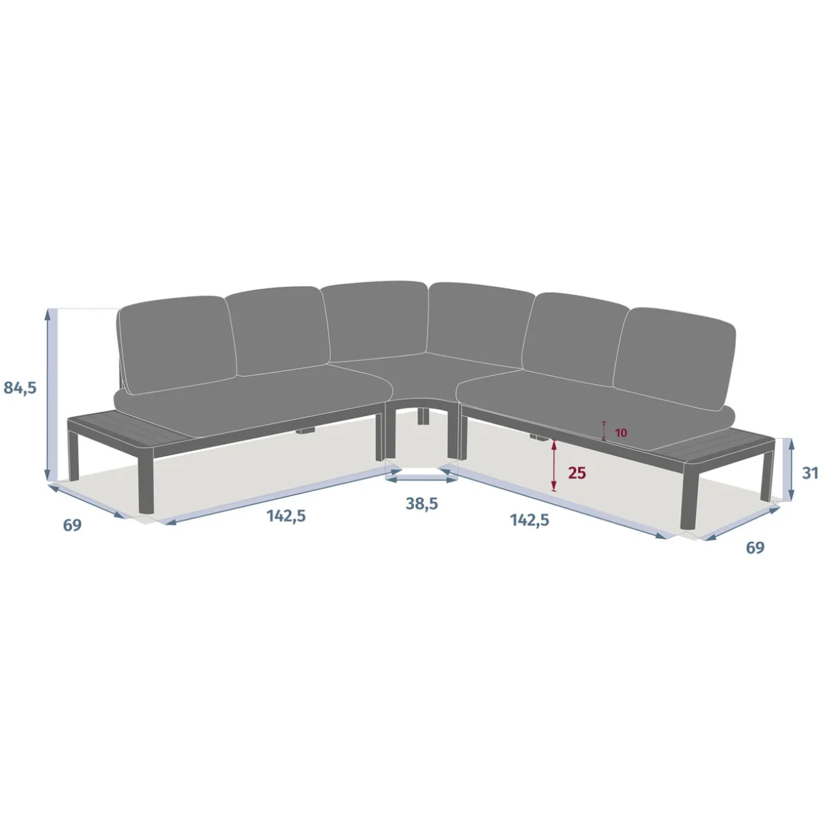 Juego de jardín angular PARADIZE gris oscuro | Aluminio, Madera de Acacia, Poliéster, 6 Plazas | Estructura tratada con epoxi antioxidante. Compuesto por un sofá esquinero de 125x79x65cm; un sillón de 80x75x66cm; una mesa alta de 86x86x38cm; una mesa baja 72.5×72.5x31cm | Fundas de cojín removibles para facilitar la limpieza. El tejido con tratamiento resistente al agua, permite que el agua deslice sin penetrar el material. Producto tratado contra decoloración. Bases ajustables para compensar irregularidades del suelo y proporcionar mejor estabilidad. | Color: Gris Oscuro | Material: Aluminio, Madera de Acacia, Poliéster | Marca: Hespéride