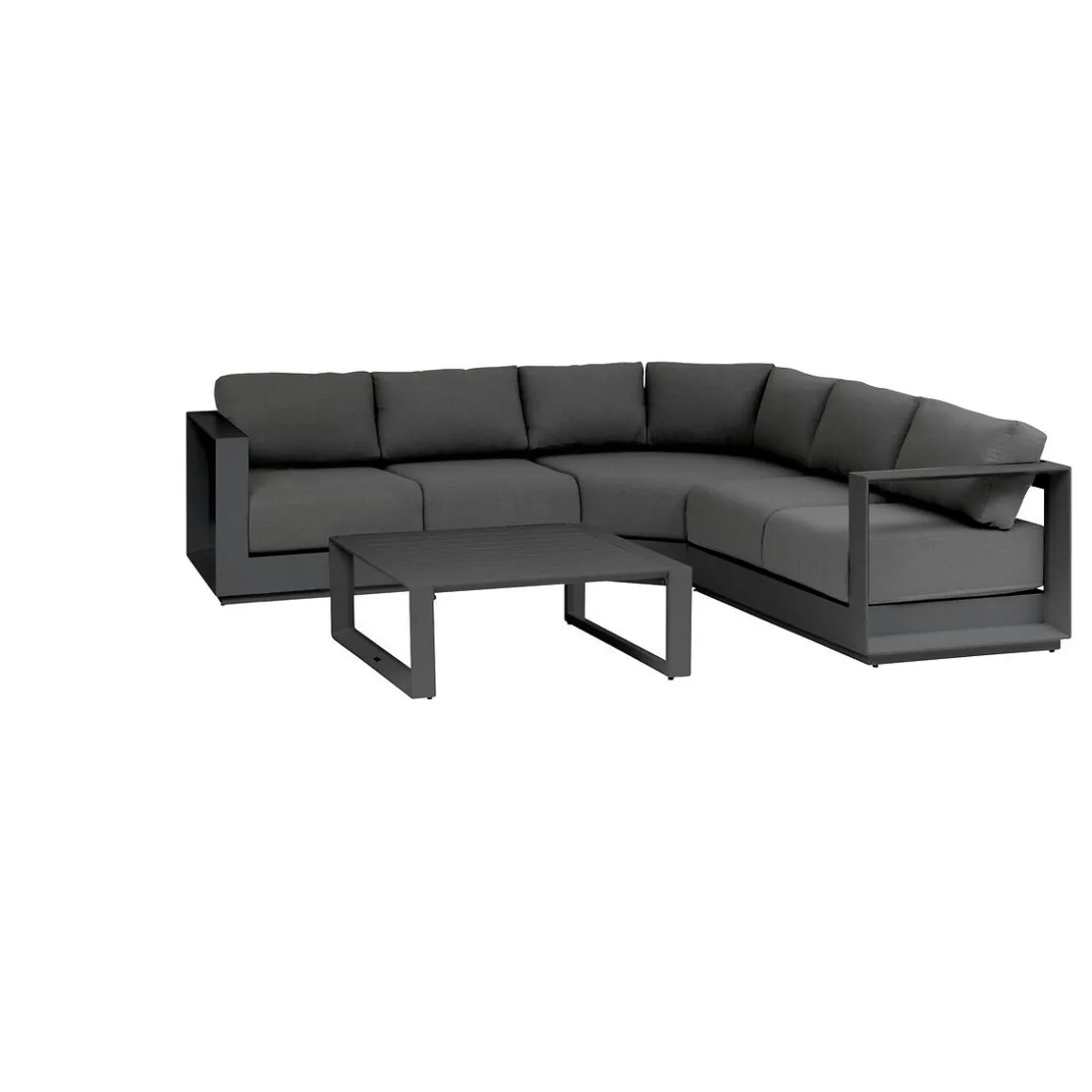 Juego de jardín esquinero ALLURE gris graphite | 5 Plazas | Material: Aluminio, Poliéster | Sofá brazo derecho: 65x80x142cm; Sofá brazo izquierdo: 65x80x142cm; Rinconera: 65x102x158cm; Mesa cuadrada: 36x97x97cm | Estructura con tratamiento epoxi antioxidante | Cojines con funda removible para facilitar la limpieza | Compatible con la referencia 412381 para proteger sus muebles del sol y las inclemencias del tiempo | Tejido con tratamiento hidrófugo que permite que el agua resbale sin penetrar en el material | Producto tratado contra la decoloración | Pies regulables para compensar las irregularidades del suelo y proporcionar una mayor estabilidad. Peso máximo soportado por plaza: 110Kg | Color: Gris grafito | Material: Aluminio, Poliéster | Marca: Hespéride