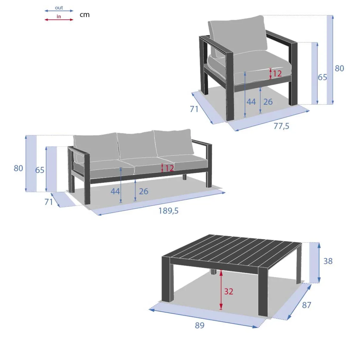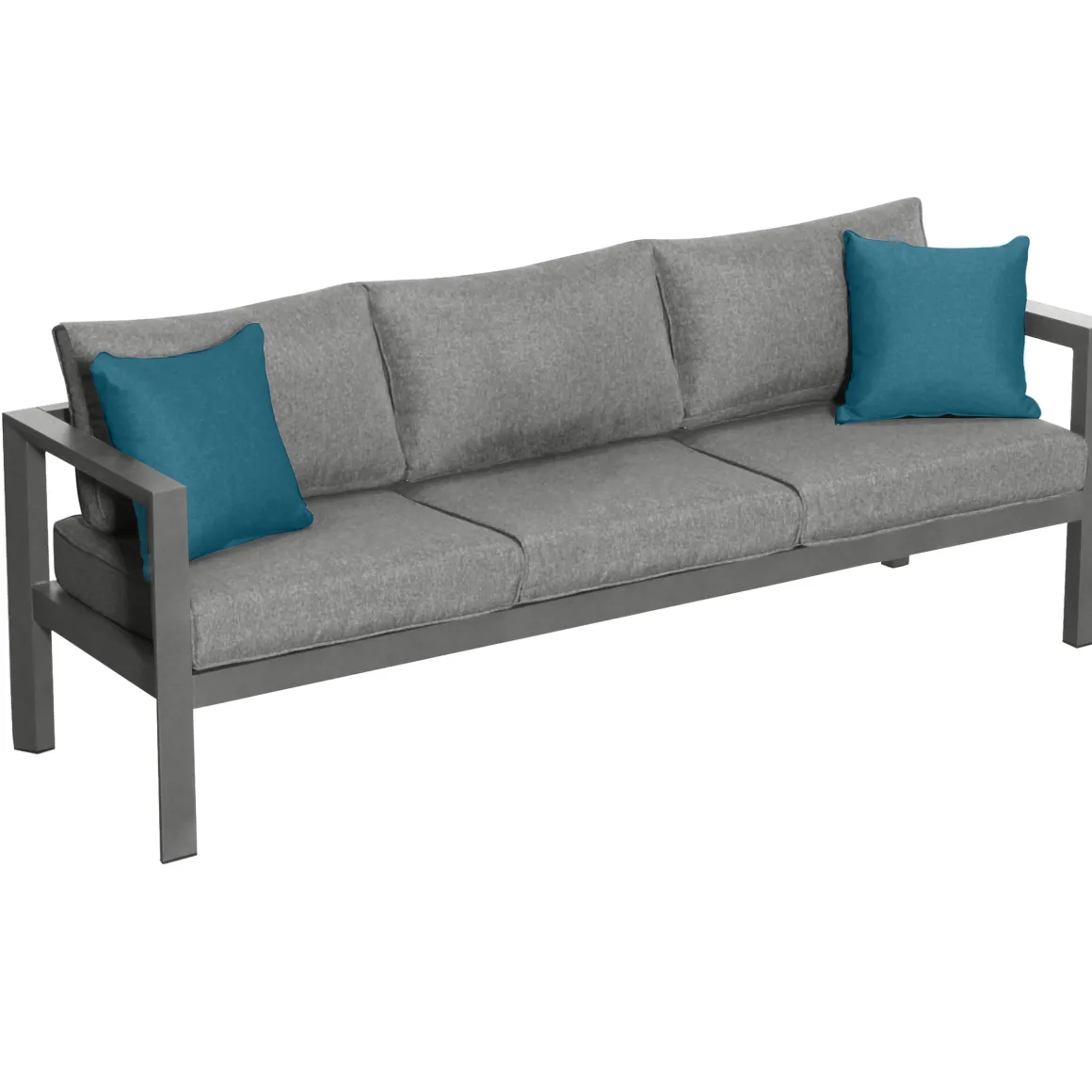 Juego de jardín EVASIÓN 5 plazas gris grafito | Compuesto por 2 sillones 77.5x71x65cm, 1 sofá de 3 plazas 190x71x65cm, 1 mesa 87×87,3x38cm | Estructura tratada con epoxi antioxidante y resistente a los rayos UV | Se puede quitar la funda de los cojines para facilitar su limpieza | Peso máximo soportado por plaza: 110Kg | 5 Cojines | Color: Grafito, Azul | Material: Aluminio, Poliéster | Marca: Hespéride | Cojines decorativos no incluidos