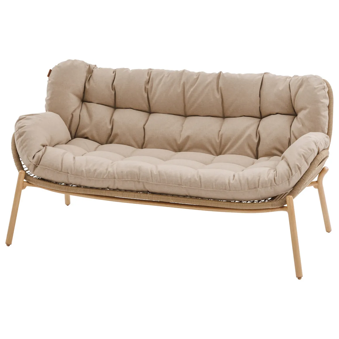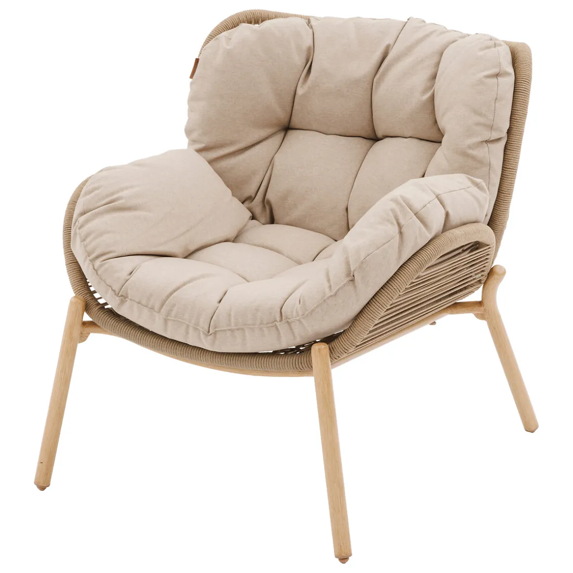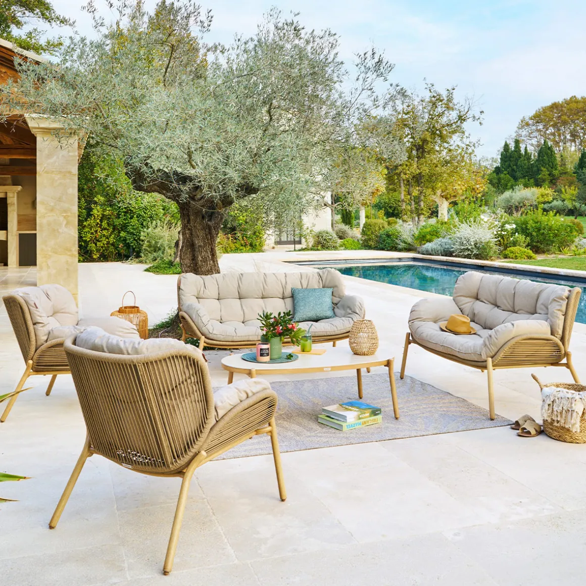 Juego de jardín MELOANE de 7 plazas efecto madera | Estructura tratada con epoxi antioxidante. Mantenimiento según las instrucciones del manual. Tejido tratado hidrófugo que permite que el agua resbale sin penetrar en el material. Producto tratado contra la decoloración. | Color: Beige | Material: Metal, Poliéster | Marca: Hespéride