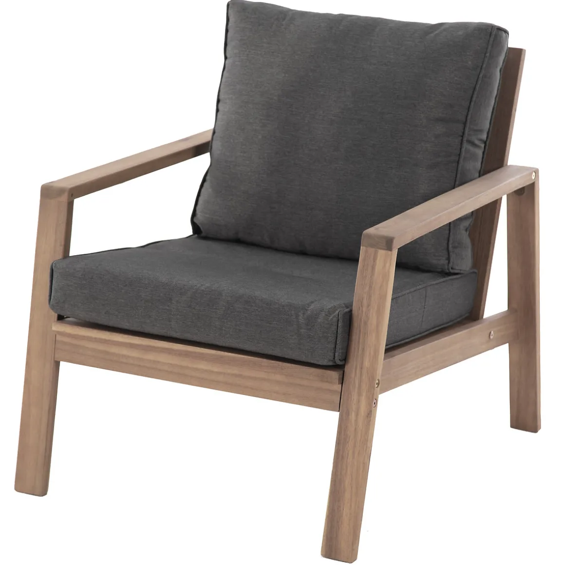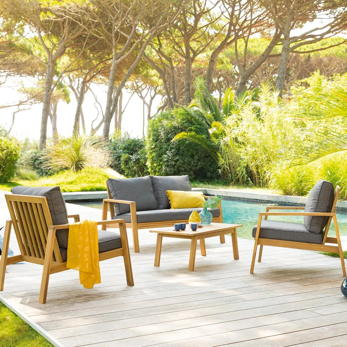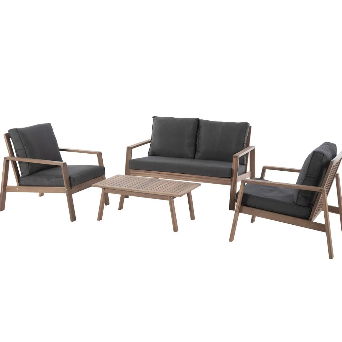 Juego de jardín TIWI de madera acacia | 4 Plazas | Este conjunto de jardín en madera de acacia está compuesto por una mesa de centro 35x50x90cm, 2 sillones 76x69x85cm y un sofá de 2 plazas 76x85x126cm con cojines en poliéster gris oscuro, impermeable al agua y donde podemos quitar las fundas para facilitar la limpieza | Madera Fsc, protegida con aceite | Tejido con tratamiento hidrófugo que permite que el agua resbale sin penetrar en el material | Peso máximo permitido por persona: 110kg | Color: Gris oscuro, Marrón | Material: Madera de acacia | Marca: Hespéride