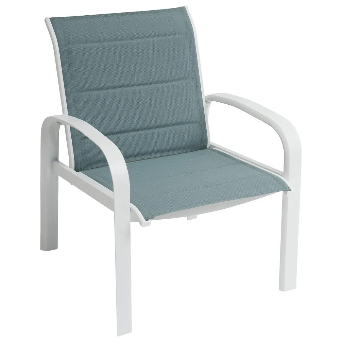 Juego ELYN verde claro y blanco de 4 plazas | Compuesto por 2 sillones, 1 sofá de 2 plazas y 1 mesa de centro | Medidas del sillón: 84x70x66cm; Medidas del sofá: 84x70x122cm; Medidas de la mesa: 46x60x104.7cm | Una creación acolchada para un confort óptimo. Espuma de secado rápido. Estructura tratada con epoxi. Producto tratado contra la decoloración, pies ajustables para compensar las irregularidades del suelo y proporcionar una mayor estabilidad. Peso máximo autorizado por persona: 110 Kg | Color del armazón: Blanco ; Color del asiento/respaldo: Verde jade | Material: Aluminio, Texaline | Marca: Hespéride