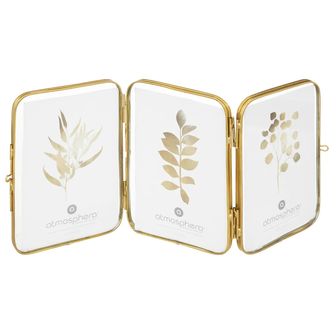 Marco De Fotos Múltiple 3 Fotos 10x15cm Metal Dorado | Descubre este y otros marcos de fotos hôma que tenemos para ti. Recuerda y decora tu casa con tus mejores momentos | Color: Dorado | Medidas: 35×0.8x16cm | Capacidad: 3 Fotos 10x15cm | Material: Latón, Vidrio | Marca: Atmosphera