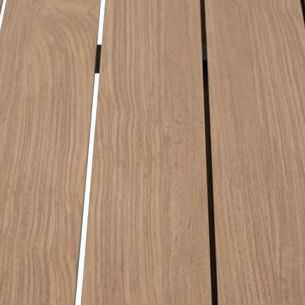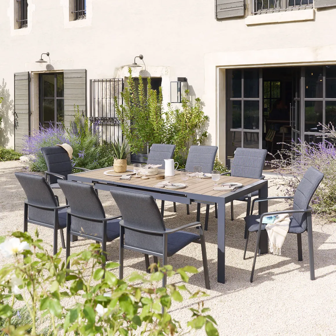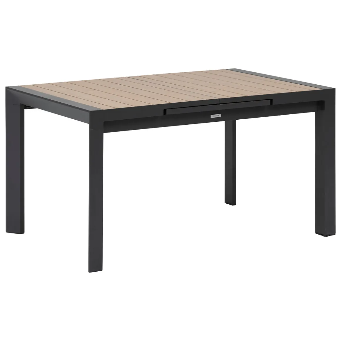 Mesa extensible automática ÉVASION honey y Graphit | Hasta 8 plazas | Aluminio, tapa ECP efecto madera | 77x90x142cm | Extensión automática | Tipo de tratamiento: epoxi | Material tapa: ECP (Extrudado calcita-plástico) | Patas regulables | Color: Miel, Grafito| Medidas: 77x90x142cm | Material: Aluminio | Marca: Hespéride