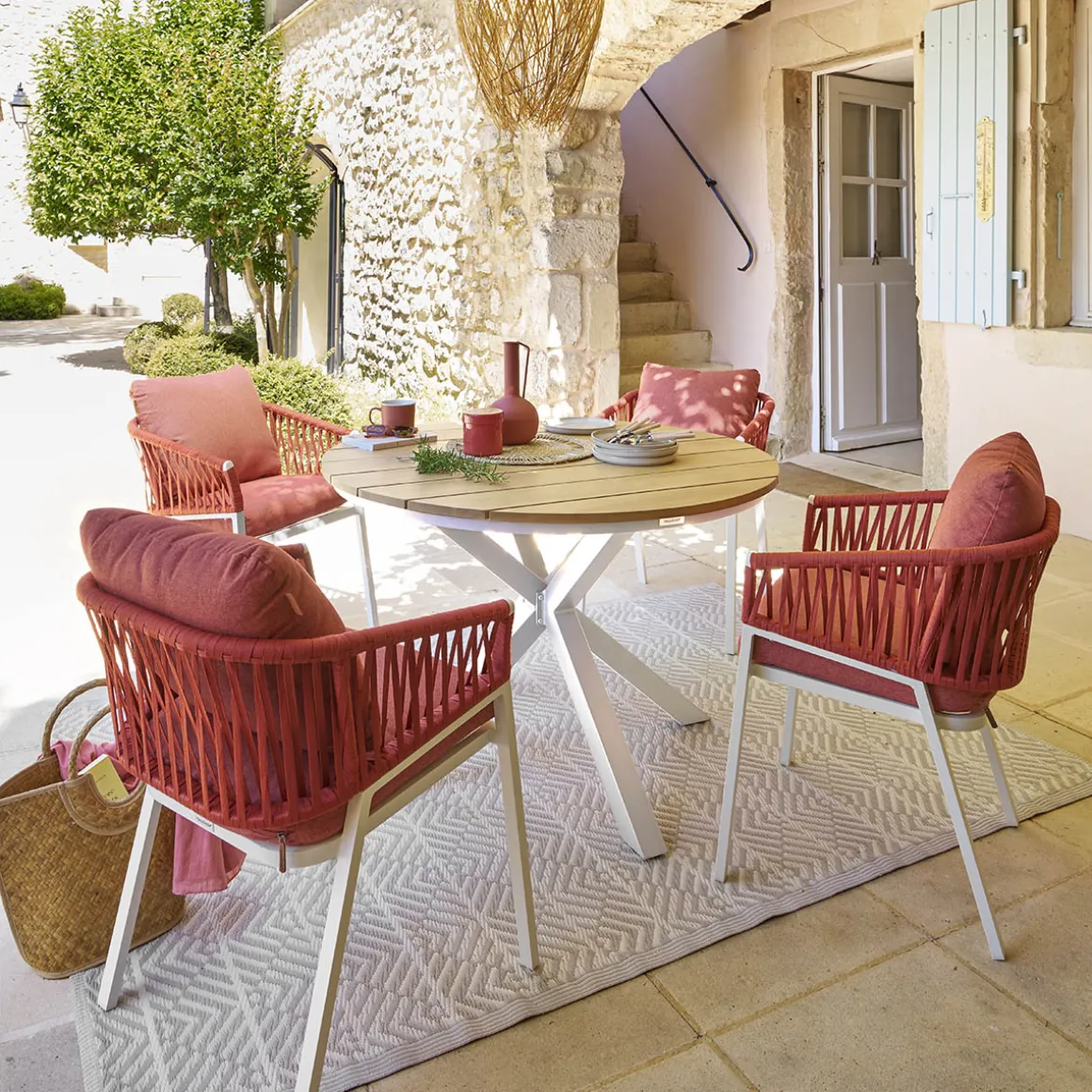 Mesa ORIENGO redonda blanca de madera acacia | 4 Personas | 75.5×111.5cm | Estructura con tratamiento epoxi antioxidante | Madera FSC, protegida con barniz. Patas de la mesa regulables para compensar las irregularidades del suelo y proporcionar una mayor estabilidad | Color: Blanco, Marrón | Medidas: 75.5×111.5cm | Material: Aluminio, Madera de Acacia | Marca: Hespéride
