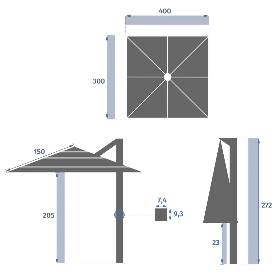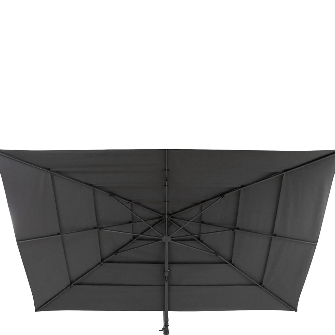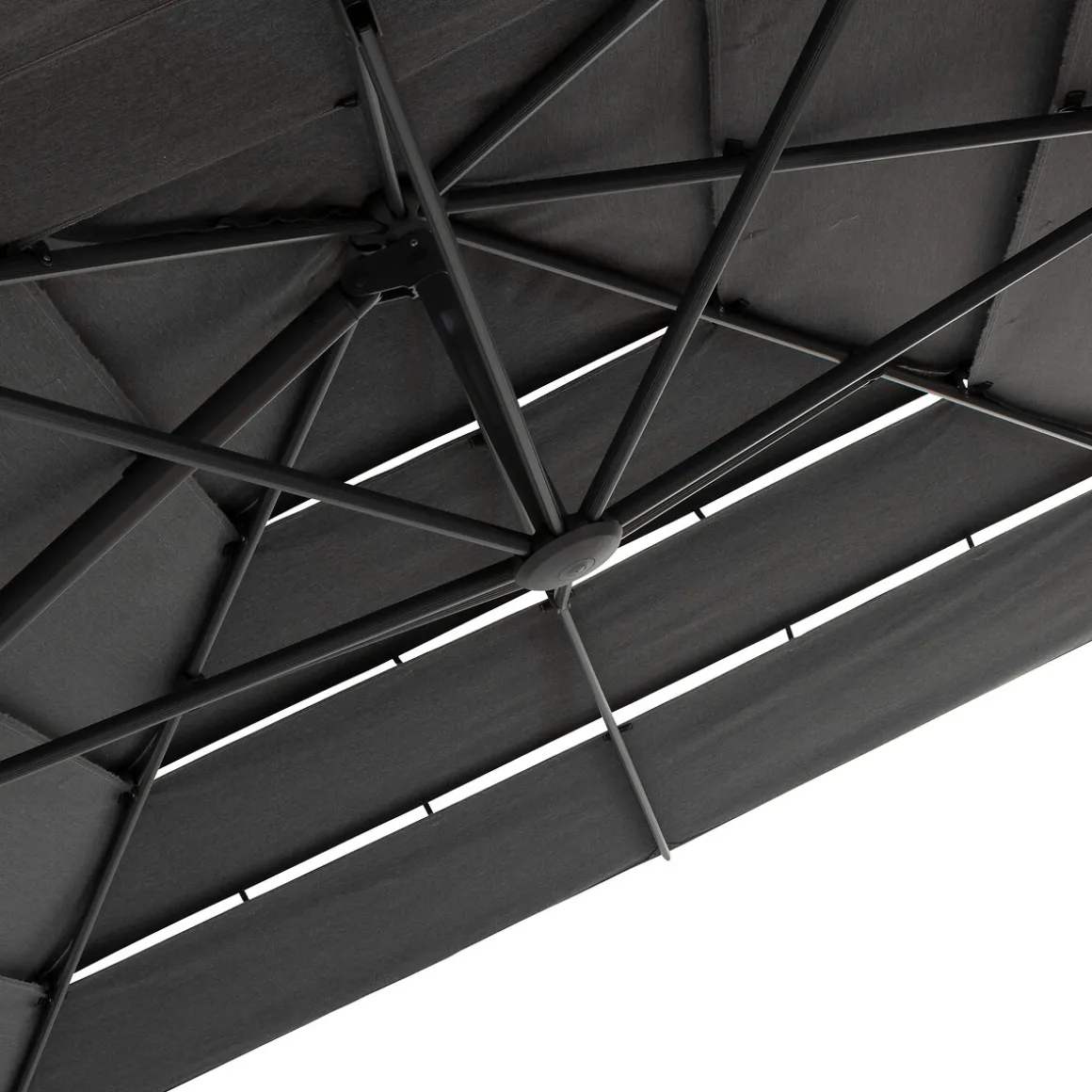 Parasol MELHIA gris graphite e antracite 4x3m | Base No Incluida | Multi-pantalla: proyecta y reduce la resistencia al viento | Tejido con tratamiento hidrófugo que permite que el agua resbale sin penetrar en el material. Apertura con manivela. Sistema de inclinación. Lona atornillada al extremo de las costillas para una mejor sujeción de la lona. Rotación de 360°. Cremallera para ajustar la altura. Chimenea de ventilación para facilitar la circulación del aire | Color: Gris | Medidas: 2.72x4x3m | Material: Aluminio, Acero, Poliéster | Marca: Hespéride
