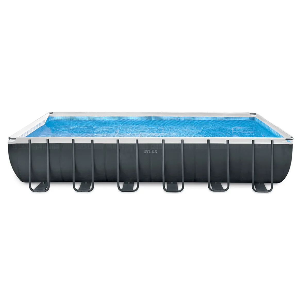 Piscina tubular desmontable Intex rectangular de 1,32×3,66×7,32M con una capacidad de 31.805 litros. Tiene una estructura metálica con barras de acero acabadas en epoxi antioxidante y una lona de color gris claro (tejido laminado de PVC/poliéster de alta resistencia con 3 capas). Este completo kit le permite disfrutar de su piscina de forma inmediata ya que incluye todos los accesorios necesarios para su uso: escalera, colchoneta, cubierta y bomba de arena con una capacidad de filtración de 7.900 litros/hora. Dispone de una tapa de desagüe que le permite conectar una manguera de jardín, para que pueda vaciar la piscina en una zona alejada de ella. | Medidas: 1,32×3,66×7,32M