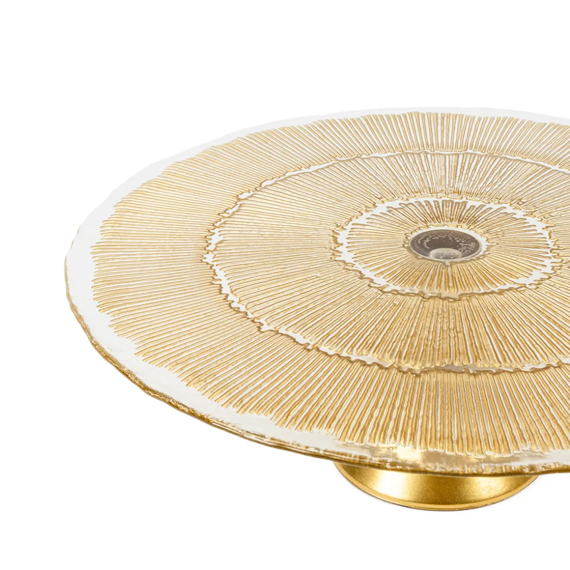 Plato De Tarta Con Pie Ixxir De Vidrio 33cm | ¡Las sugerencias para las mesas de navidad de la colección hô! hô! hôma! Son lindas, originales, clásicas y hacen la mágia acontecer. La preparación de las recetas tradicionales puede acontecer en un ambiente navideño rodeado de todos los accesorios y utensilios de cocina, y los sabores servidos en las vajillas más especiales. Añade amor a todo lo que vayas a servir y tendrás la mejor Navidad. | Color: Dorado | Material: Vidrio | Medidas: 33cm