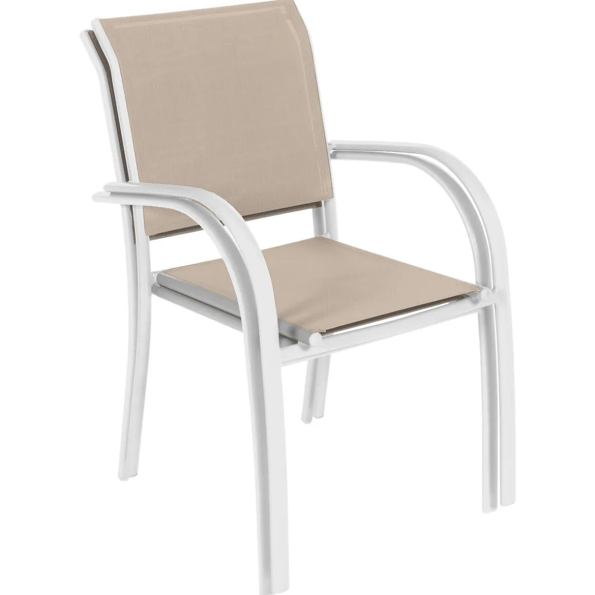 Silla PIAZZA lino y blanco | 88x56x65cm | Con líneas redondeadas y revestimiento en textilene, ofrece un asiento confortable | Producto apilable, fácil de almacenar para un verdadero ahorro de espacio | Para una mejor armonía, combine este producto con los de la línea Piazza | Estructura con tratamiento epoxi antioxidante | Color: Lino, Blanco | Medidas: 88x56x65cm | Material: Aluminio, Textilene | Colección: Piazza | Marca: Hespéride