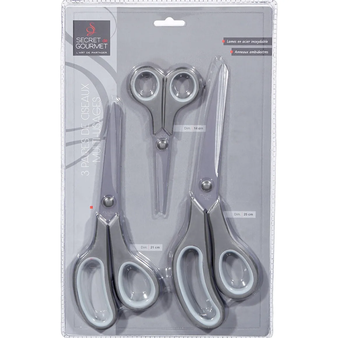 Tijeras Multiusos X3 | Todo lo que tu mesa necesita está en homa.es, echa un vistazo a nuestra colección de vajillas, vasos, cubiertos, posavasos, soportes, etc. ¡Sirve con Happy Home Living, y todo sabrá mucho mejor! | Color: Gris | Medidas: 25x8x1.10cm | Medidas Detalladas: Tijera Grande: 25×7.5cm, Tijera Mediana: 21.50×7.5cm, Tijera Pequeña: 14×6.4cm | Material: Acero Inoxidable, Polipropileno | Marca: Secret D’Gourmet