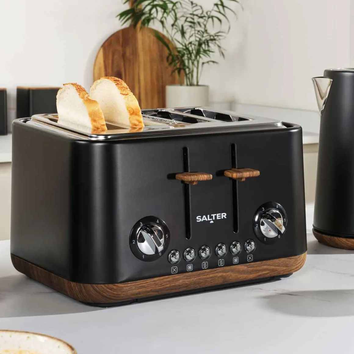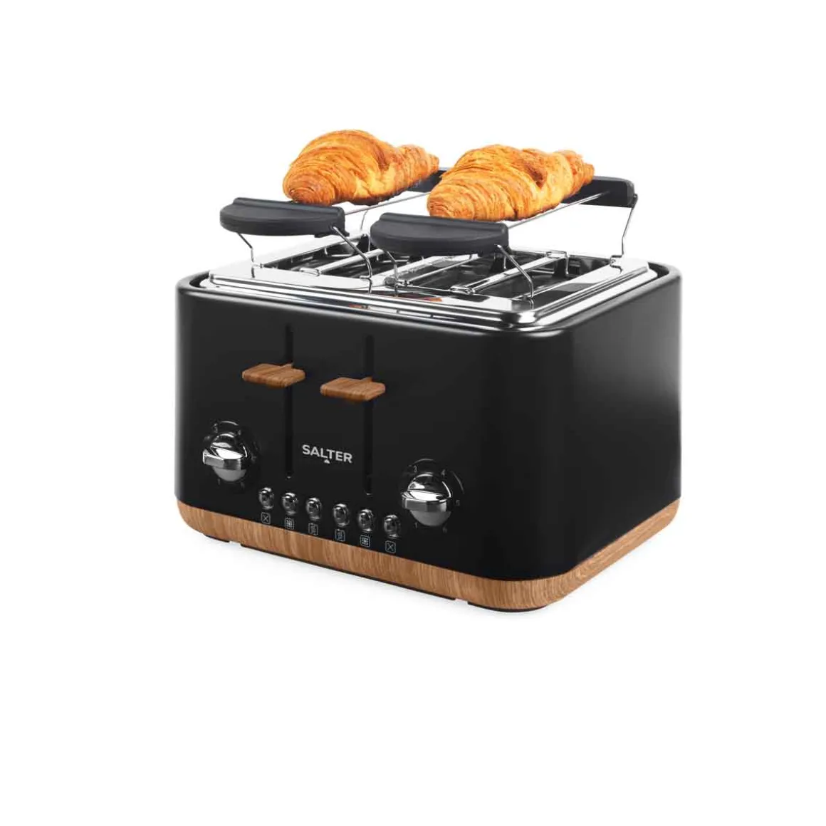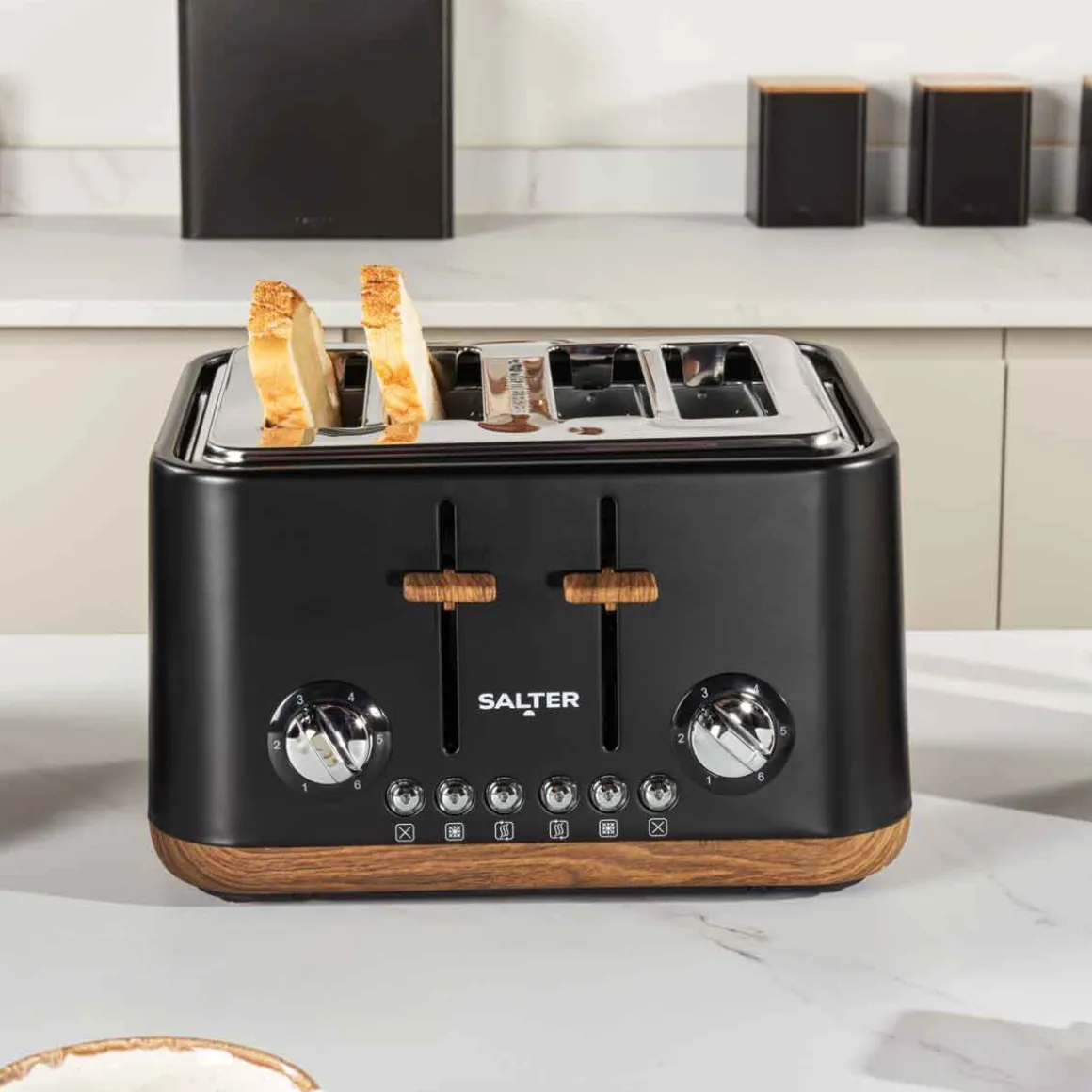 Tostadora 4 rebanadas SALTER TORONTO negra | Potencia máxima: 1630w | Funciones de descongelación y recalentamiento. 6 posiciones de calor. Con bandeja recogemigas fácil de extraer. ¿Sabías que tu cocina puede ser el lugar más feliz del mundo? Descubre nuestra gama de utensilios para una cocina llena de Happy Home Living. Cocinar con los utensilios adecuados es mucho más fácil. | Color: Negro | Medidas: 24.2×32.6×36.4cm | Material: Acero inoxidable