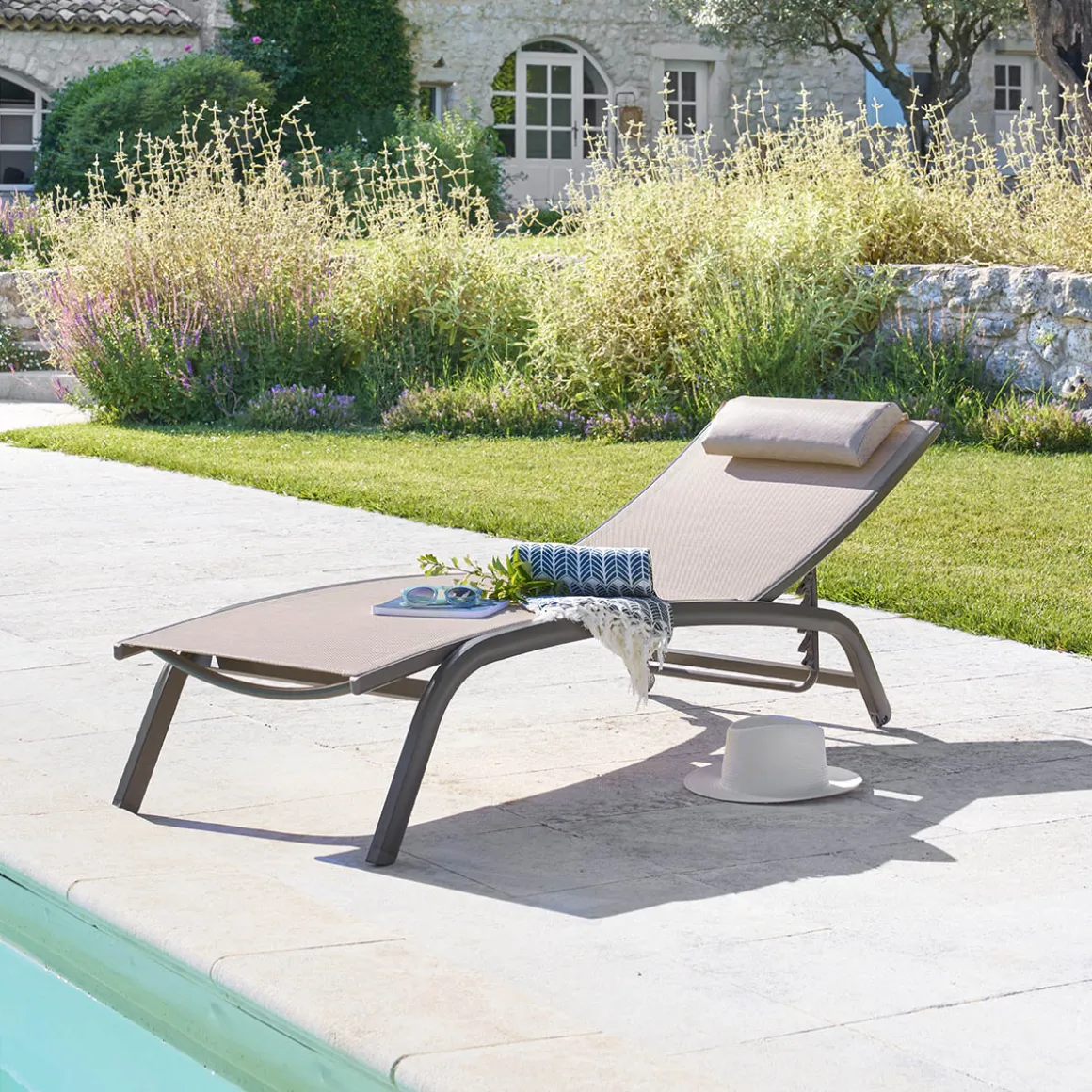 Tumbona BONAO lino y tonka | 4 posiciones | 83x64x194cm | Estructura con tratamiento epoxi antioxidante | Producto apilable, fácil de guardar para un verdadero ahorro de espacio | Hasta 4 posiciones de reclinado. Posición 100% reclinable para un confort óptimo | Fácil de desplazar gracias a las ruedas | Producto tratado contra la decoloración | Color: Lino | Medidas: 83x64x194cm | Material: Aluminio, Textilene | Marca: Hespéride
