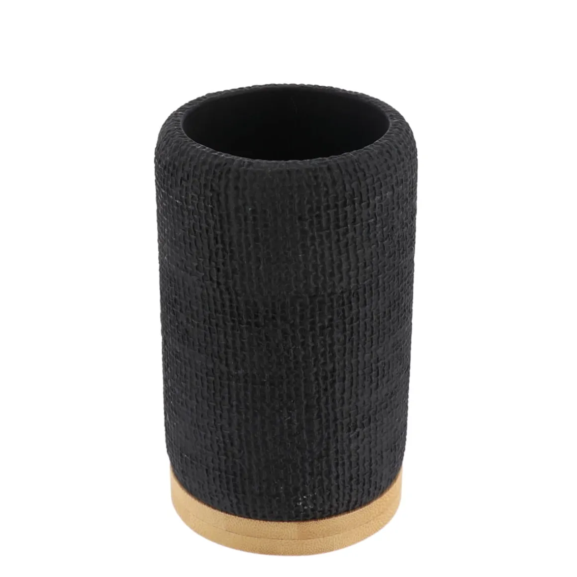 Vaso de lavabo efecto red negro con base de bambú | 12.5×7.5cm | Los accesorios de Baño y de organización son esenciales para que las rutinas más personales te proporcionen todo el bienestar que mereces. Conoce nuestra nueva colección de accesorios de baño | Color: Negro, Beige | Medidas: 12.5×7.5cm | Material: Poliresina, Bambú