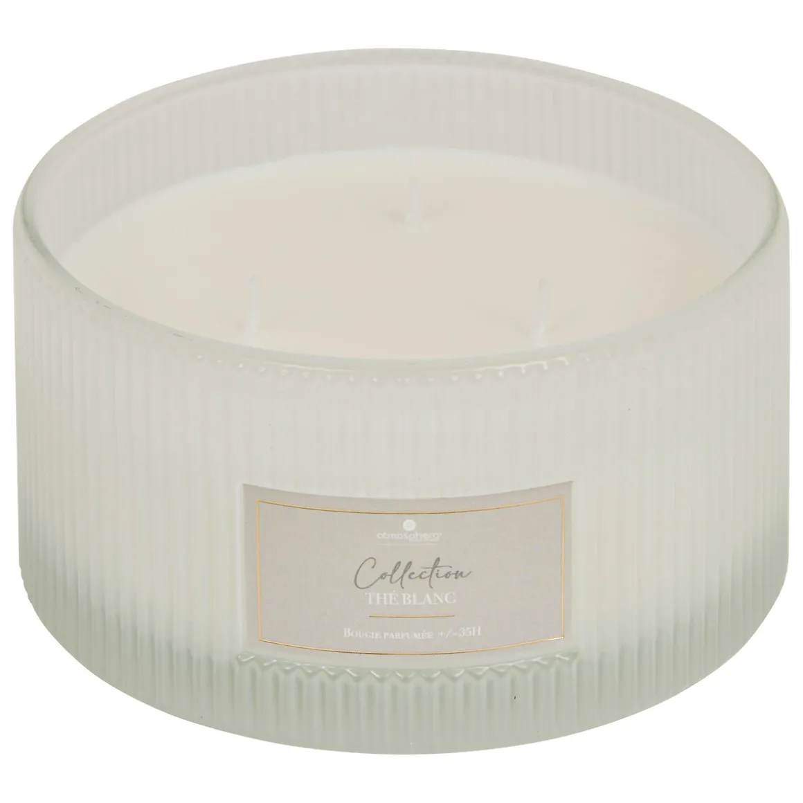 Vela perfumada con portavelas de vidrio COLLECTION thé blanc 635gr | Descubra nuestra gama de velas y velones decorativos para el hogar. La mejor decoración para el hogar es hôma. | Color: Blanco | Medidas: 8,1×15,1×15,1cm | Material: Vidrio y Parafina | Aroma: Thé Blanc | Capacidad: 635gr | Marca: Atmosphera